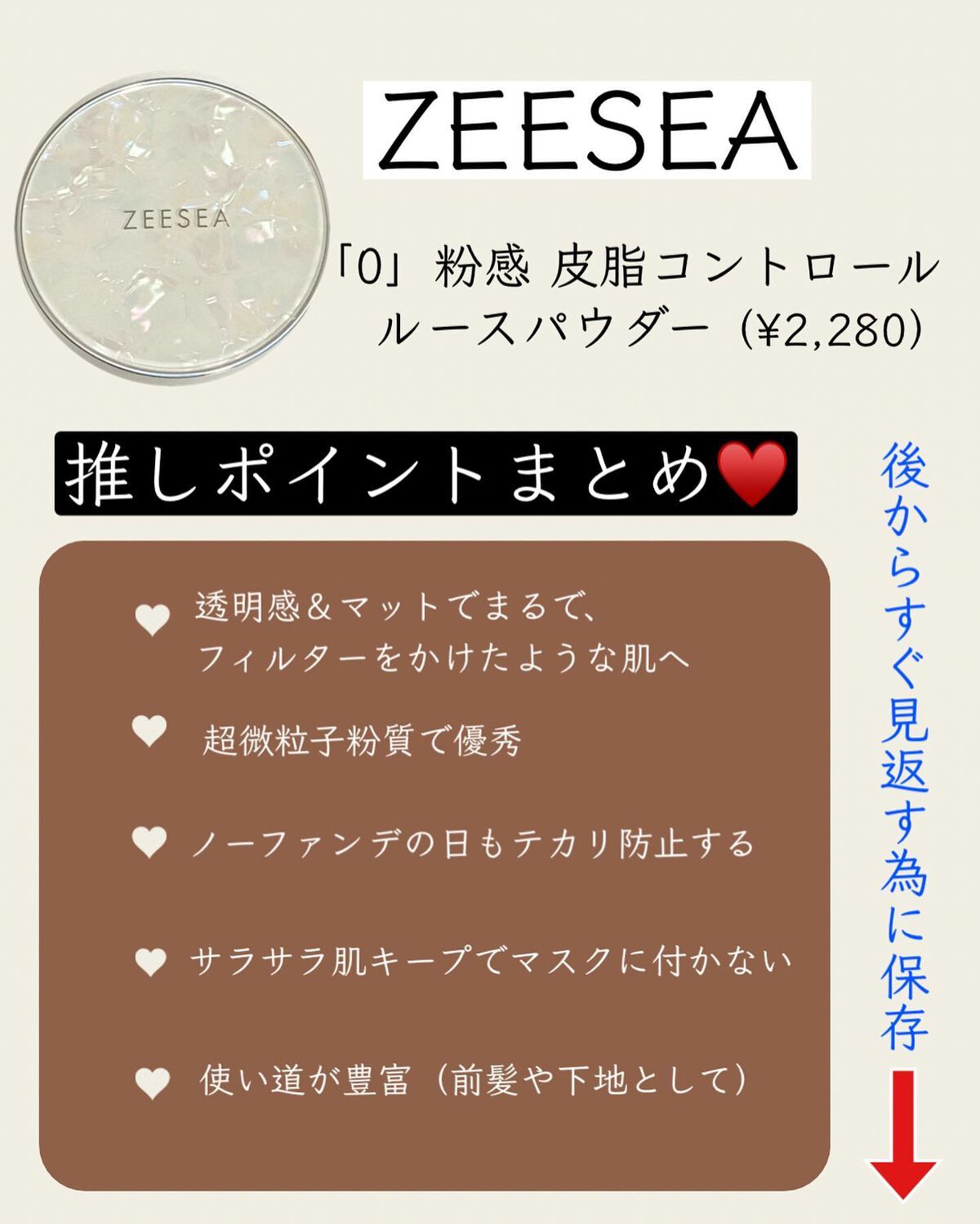 ずっと狙ってたけど、内容量の割に高いからずっと買えてなかったZEESEAのパウダー 店舗で割引になってたので即購入(ケチ) ベージュなので白浮きしないのが嬉しい。 いつもはKOSEのメイクキープパウダーを愛用してるのだけど、こっちの方がよりサラッサラになる。 ほんとに粉が軽くて微細なので粉っぽくならないし、まさにゼロ粉感。 高い理由が分かったわ
