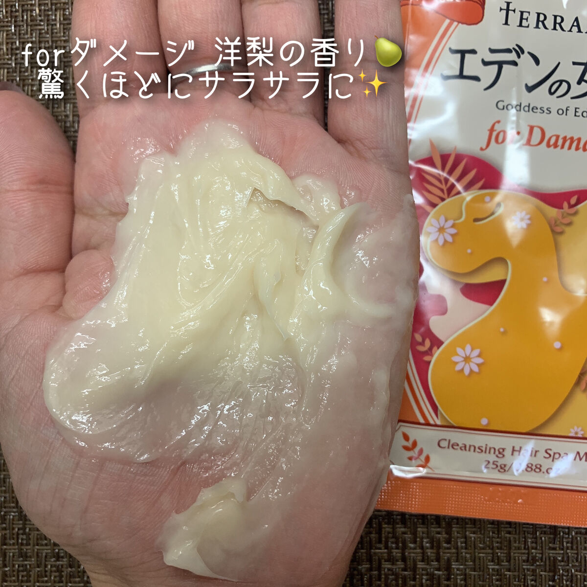 洗浄力は、一般的なシャンプーと同等かそれ以上なので、汚れはしっかり落とせるのはもちろん、髪と地肌に必要なうるおいは残します。 使い方も簡単!濡れた髪と地肌にしっかりなじませるだけ。泡立てる必要がないから、余計な摩擦ダメージも減らせます。 それぞれパッケージに女神様のデザインが描かれているのがすごくかわいいですよね。 やや黄色みがかったトリートメントのようなテクスチャーなのでこってりとした感じです。 そのまま頭皮から髪の毛の毛先まで全体に使えるのにシャンプー、トリートメントヘアパックをこちら1つですべてこなしてくれるのですごく時短になります。 10分置いてみると髪の毛がしっとりとしてしっかり浸透してくれた様子。