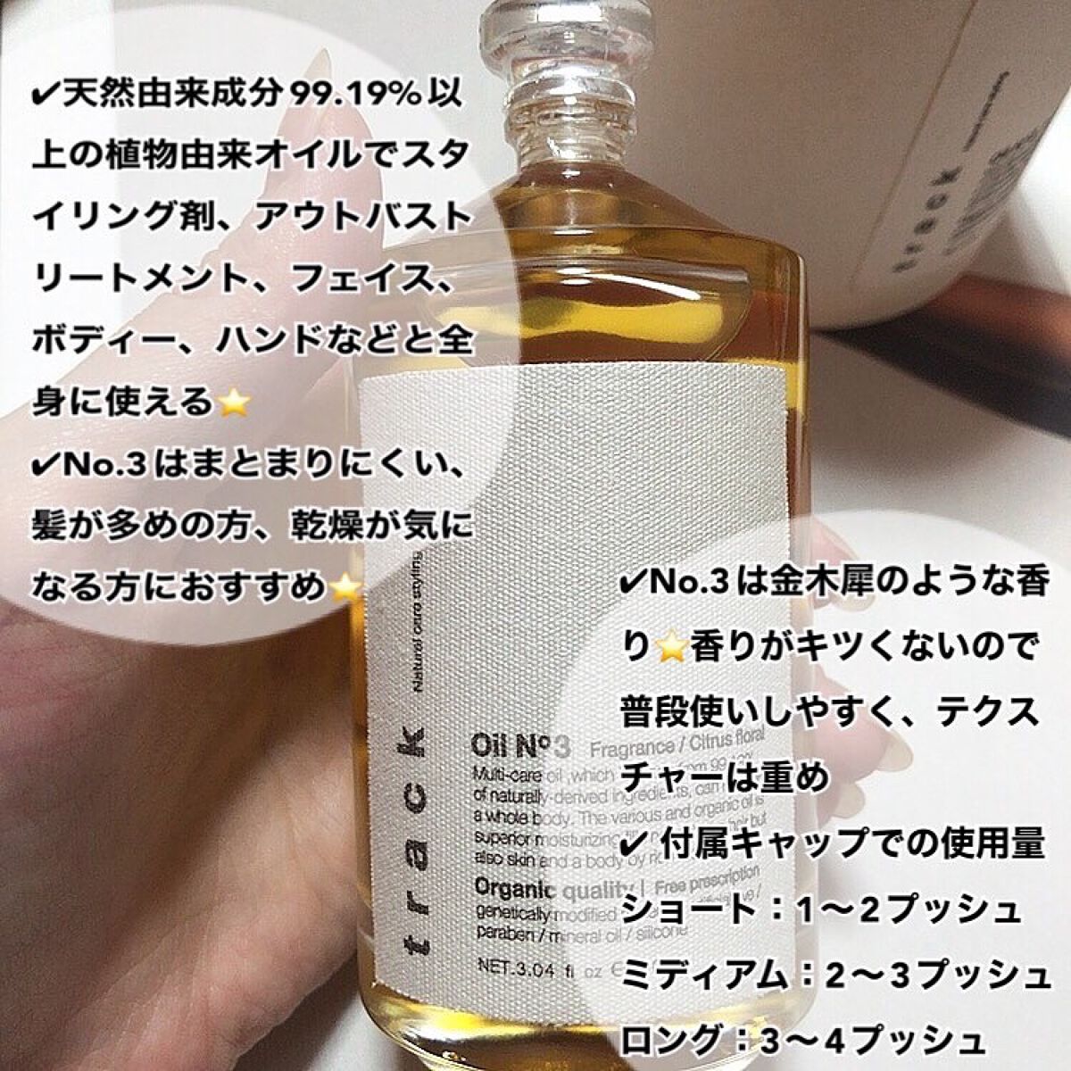 - ■track oil No1(天然由来成分100%)フレッシュシトラスの香り 優しいツヤとうるおいで上品な素髪感を ■track oil No2(天然由来成分99.2%)シトラスハーブの香り 凛としたツヤとみずみずしさで端正な印象を ■track oil No3(天然由来成分99.19%)シトラスフローラルの香り 息づくツヤと深いうるおいでまとまりある表情を
