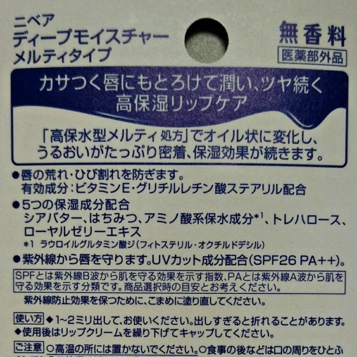 - 【医薬部外品】 カサつく唇にとろけて密着。高保湿・ツヤ続くリップクリーム。 「高保水型メルティ処方」で、塗った瞬間クリームがオイル状に変化し、うるおいがたっぷり密着。 保湿効果が続きます。唇の荒れ、ひび割れを防ぎます。 有効成分(ビタミンE・グリチルレチン酸ステアリル)配合。 紫外線から唇を守ります。 UVカット成分配合(SPF26/PA++)。 紫外線防止効果を保つために、こまめに塗り直してください。