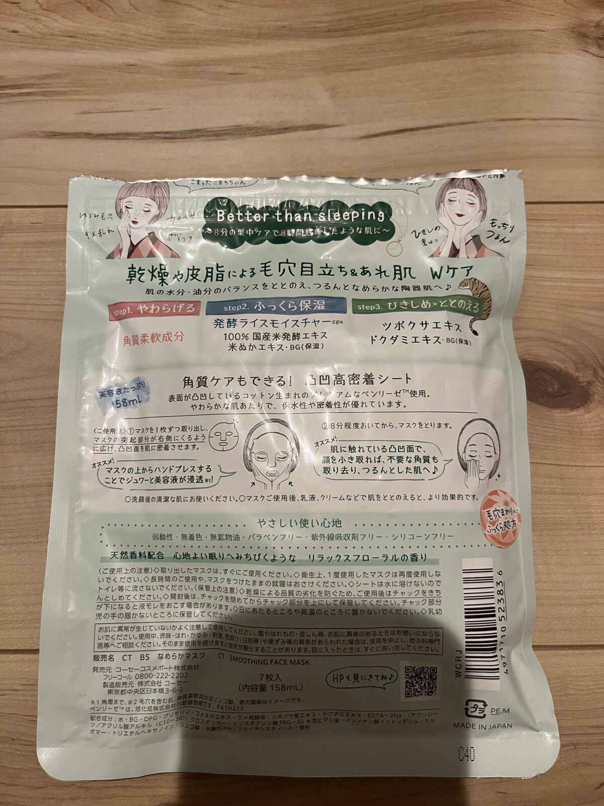 - 毛穴・肌あれが同時にケアできる、毛穴小町マスク! ①毛穴目立ち&肌あれをダブルでケア!なめらか陶器肌へ 水分・油分をバランスよく配合したみずみずしい美容液で、乾燥や皮脂による毛穴目立ちやあれ肌もケアします。キメのととのった、つるんとなめらかな陶器肌に導きます。 角質柔軟成分※3配合。肌をやわらげます。 100%国産米発酵エキス・米ぬかエキス・BG(保湿)をはじめとする発酵ライスモイスチャーCPX配合。ふっくらと保湿します。 ツボクサエキス・ドクダミエキス・BG(保湿)配合。ツボクサエキスは今話題のCICA成分です。肌をひきしめととのえます。 ※3 角質柔軟成分はリンゴ酸 ②角質ケアできる凸凹高密着シート コットン生まれでやわらかな肌触りの国産シートを採用。シートマスクの表面には凸凹のエンボス加工を施しているため、密着性が高く、はがしたマスクでやさしく顔をふきとることで角質ケアもできます。 ③心地よい眠りにみちびくようなリラックスフローラルの香り(天然香料配合) ④やさしい使い心地 弱酸性・無着色・無鉱物油・パラベンフリー・紫外線吸収剤フリー・シリコーンフリーのやさしい使い心地です。
