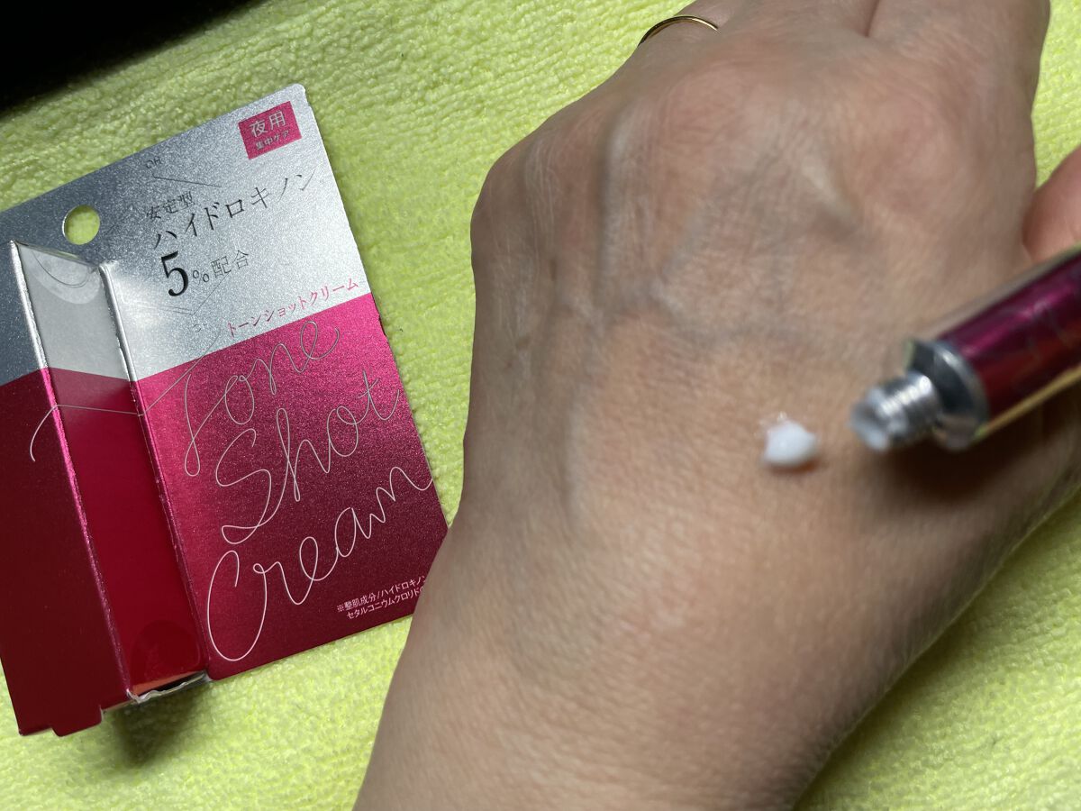 従来のハイドロキノンを改良し、安定性と浸透力を兼ね備えた 安定型ハイドロキノン※(SHQ-1®)を5%配合しました。 夜の洗顔後にいつものスキンケア(化粧水・乳液等)で肌を整えたあと、気になる部分に重ねて叩くようにやさしくなじませます。 成分が徐々に溶け出し角質層まで、ゆっくり浸透します。 とても軽い塗り心地で、刺激は何も感じませんでした。