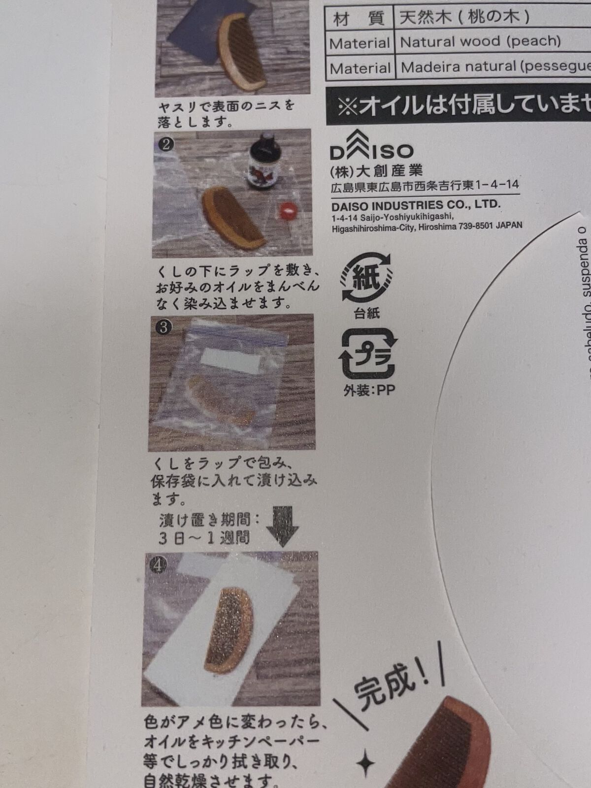 椿オイルなどに漬け込みできる木くし✨#DAISO#桃の木くしお好みのオイル、椿やあんずなどをくしに漬け込んでオイルくしがつくれちゃう!そのまま使えば普通の木くしです。漬け込み方法も記載されていました。オイルをたっぷり漬け込み、ラップで包んで数...