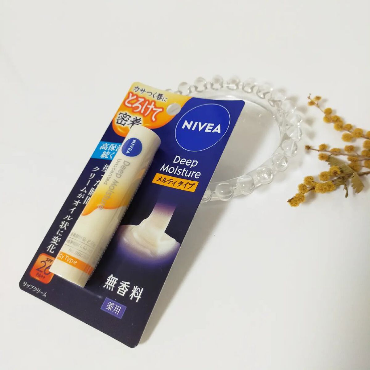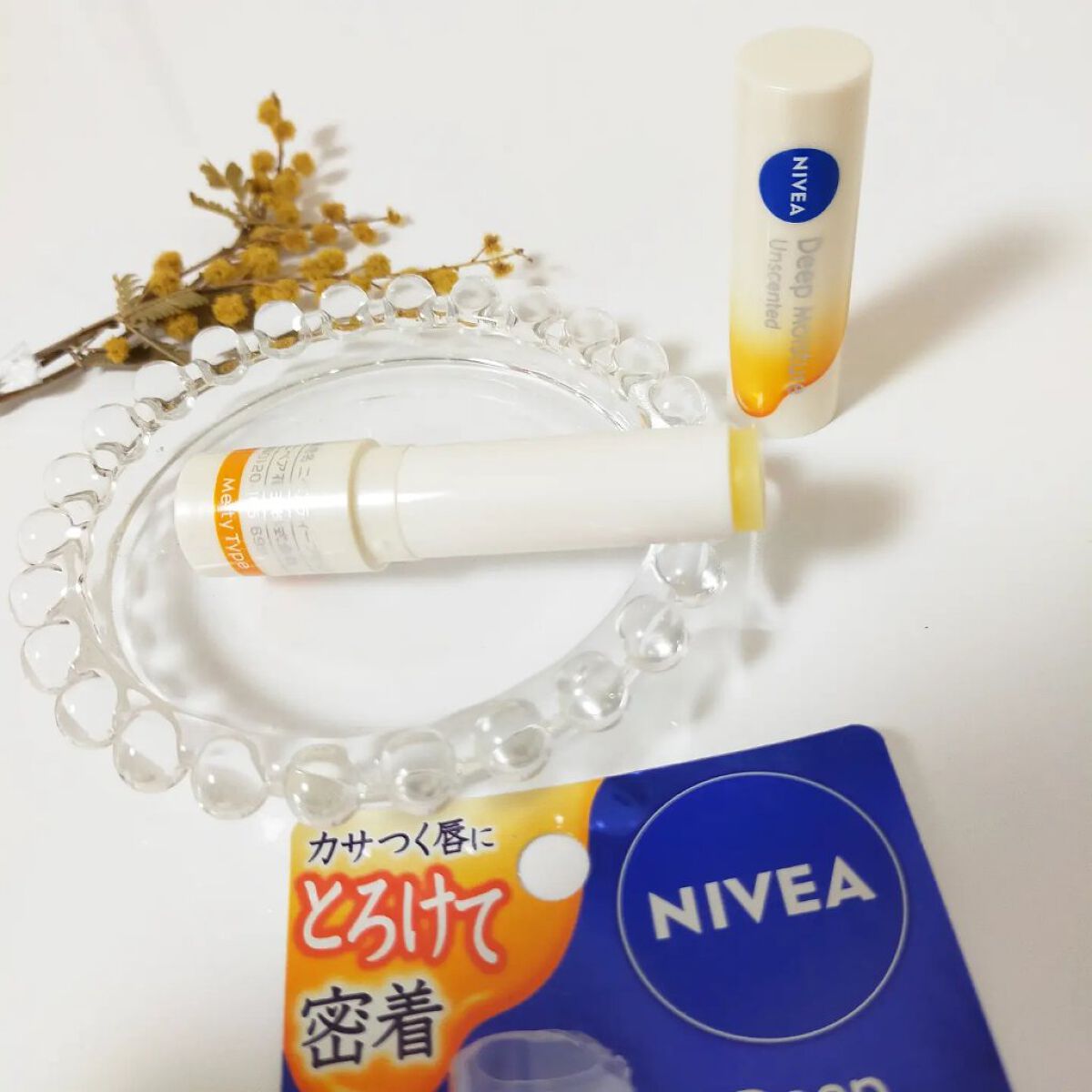 【ニベアディープモイスチャーリップメルティタイプ】とろけて密着💛唇につけた瞬間オイル状に変化してなめらかにスルスルぬれるリップクリームです!密着力が高くしっとり保湿される感じがお気に入りです!カサついた唇もこれを使うとツヤっとしてくれます!S...