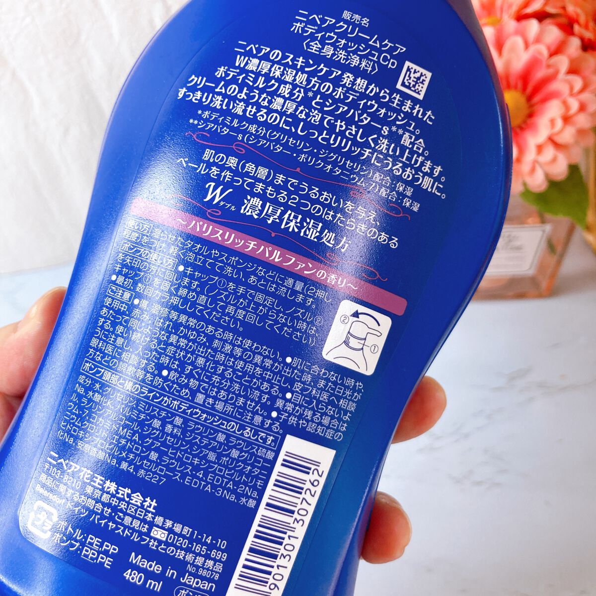 - ニベアのスキンケア発想から生まれたW濃厚保湿※処方のボディウォッシュ。ボディミルク成分*とシアバターs**配合。 クリームのような濃厚な泡でやさしく洗い上げます。すっきり洗い流せるのに、しっとりリッチにうるおう肌に。 パリスリッチパルファンの香り。 *ボディミルク成分(グリセリン・ジグリセリン)配合:保湿**シアバターs(シアバター・ポリクオタニウム‐7)配合:保湿 ※うるおいを与えて、まもる