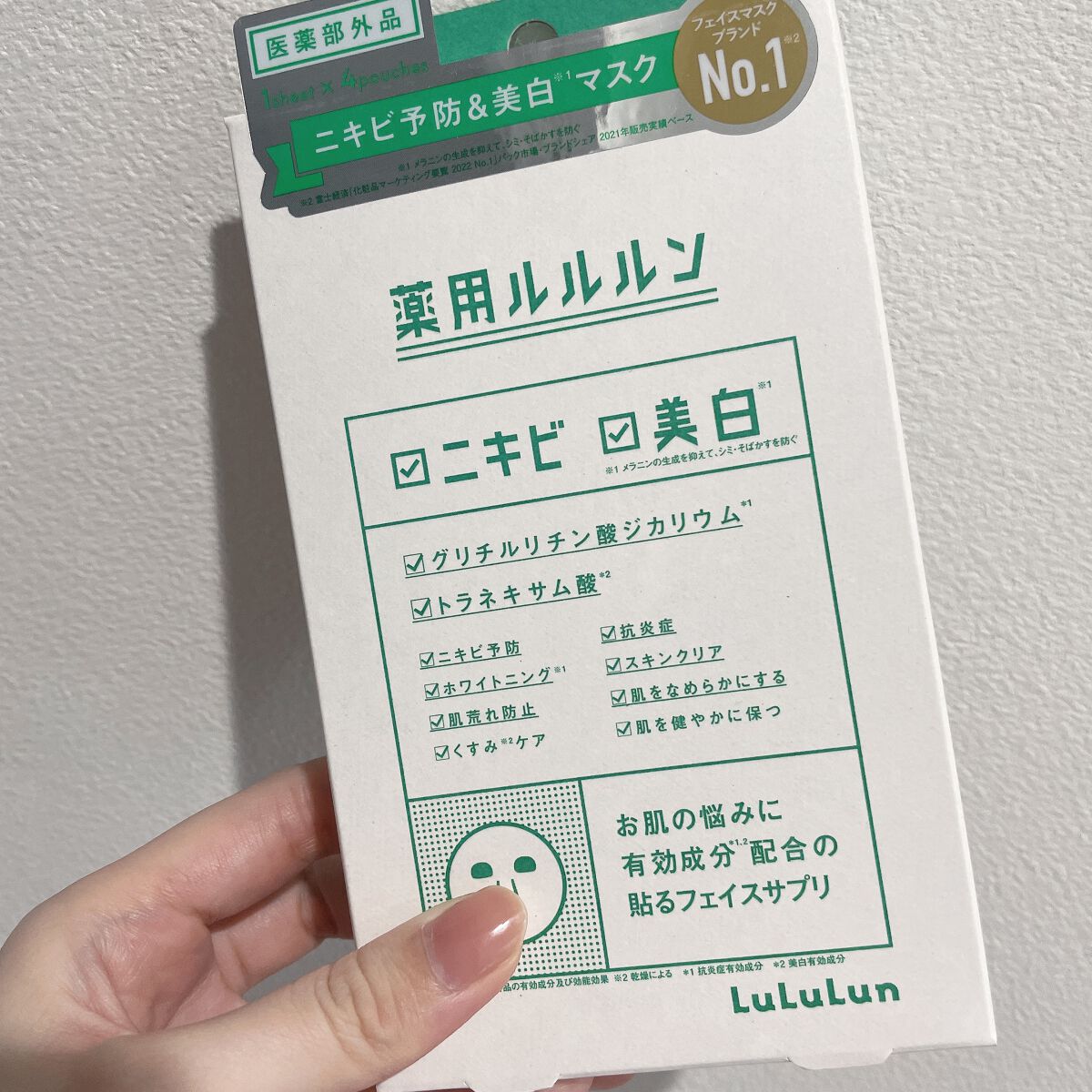 - 【医薬部外品】 ルルルン初の医薬部外品、「薬用ルルルン」が登場。 「薬用ルルルン 美白アクネ」はニキビを予防したい方、美白※1・くすみ※2をケアしたい方におすすめ。 (※1 メラニンの生成を抑えて、シミ・そばかすを防ぐ ※2乾燥による)