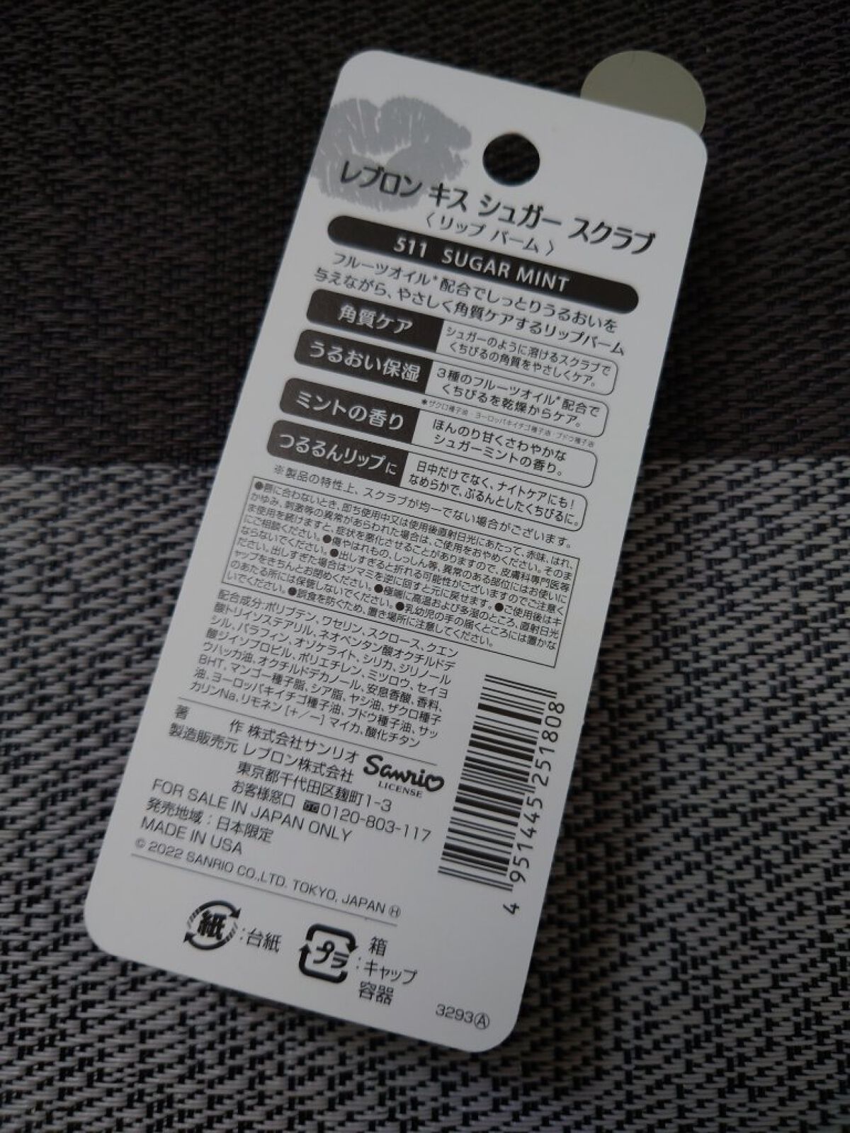 - <111 シュガーミント> ポリブテン、ワセリン、スクロース、クエン酸トリイソステアリル、ネオペンタン酸オクチルドデシル、パラフィン、オゾケライト、シリカ、ジリノール酸ジイソプロピル、ポリエチレン、ミツロウ、セイヨウハッカ油、オクチルドデカノール、安息香酸、香料、BHT、マンゴー種子脂、シア脂、ヤシ油、ザクロ種子油、ヨーロッパキイチゴ種子油、ブドウ種子油、サッカリンNa、リモネン(+/-)マイカ、酸化チタン <113 スウィート ユズ> ポリブテン、ワセリン、スクロース、ネオペンタン酸オクチルドデシル、クエン酸トリイソステアリル、パラフィン、オゾケライト、マイカ、シリカ、ジリノール酸ジイソプロピル、ポリエチレン、ミツロウ、オクチルドデカノール、酢酸トコフェロール、シア脂、ヤシ油、マンゴー種子脂、ザクロ種子油、ブドウ種子油、ヨーロッパキイチゴ種子油、サッカリンNa、香料、リモネン、リナロール、シトラール、安息香酸ベンジル、酸化チタン、黄4 <114 ペパーミント> ポリブテン、ワセリン、スクロース、ネオペンタン酸オクチルドデシル、クエン酸トリイソステアリル、パラフィン、オゾケライト、シリカ、ジリノール酸ジイソプロピル、ポリエチレン、BHT、シア脂、ミツロウ、ヤシ油、マンゴー種子脂、オクチルドデカノール、ザクロ種子油、ヨーロッパキイチゴ種子油、サッカリンNa、ブドウ種子油、香料、安息香酸、クエン酸 [+/-] マイカ、水酸化Al、酸化チタン、黄4、赤202、青1 <115 スウィート サクラ> ポリブテン、ワセリン、スクロース、ネオペンタン酸オクチルドデシル、クエン酸トリイソステアリル、パラフィン、オゾケライト、シリカ、ジリノール酸ジイソプロピル、ポリエチレン、BHT、シア脂、ミツロウ、ヤシ油、マンゴー種子脂、オクチルドデカノール、ザクロ種子油、ヨーロッパキイチゴ種子油、サッカリンNa、ブドウ種子油、香料、安息香酸、クエン酸 [+/-] マイカ、水酸化Al、酸化チタン、黄4、赤202、青1 <116 ピーチ> ポリブテン、ワセリン、スクロース、ネオペンタン酸オクチルドデシル、クエン酸トリイソステアリル、パラフィン、オゾケライト、シリカ、マイカ、ジリノール酸ジイソプロピル、ポリエチレン、ミツロウ、オクチルドデカノール、酢酸トコフェロール、シア脂、ヤシ油、マンゴー種子脂、ザクロ種子油、ブドウ種子油、ヨーロッパキイチゴ種子油、サッカリンNa、香料、酸化鉄、クエン酸、酸化チタン、黄4 <117 アサイー ベリー> ポリブテン、ワセリン、スクロース、ネオペンタン酸オクチルドデシル、クエン酸トリイソステアリル、パラフィン、オゾケライト、シリカ、マイカ、ジリノール酸ジイソプロピル、ポリエチレン、マロン酸ジエチルヘキシルシリンギリデン、ミツロウ、オクチルドデカノール、トリ(カプリル酸/カプリン酸)グリセリル、シア脂、ヤシ油、マンゴー種子脂、ザクロ種子油、ブドウ種子油、ヨーロッパキイチゴ種子油、ヒマワリ種子油、ローズマリー葉エキス、クエン酸、水酸化Al、サッカリンNa、香料、BHT、安息香酸 [+/-] 酸化チタン、マンガンバイオレット、赤202