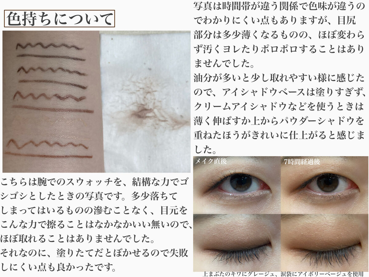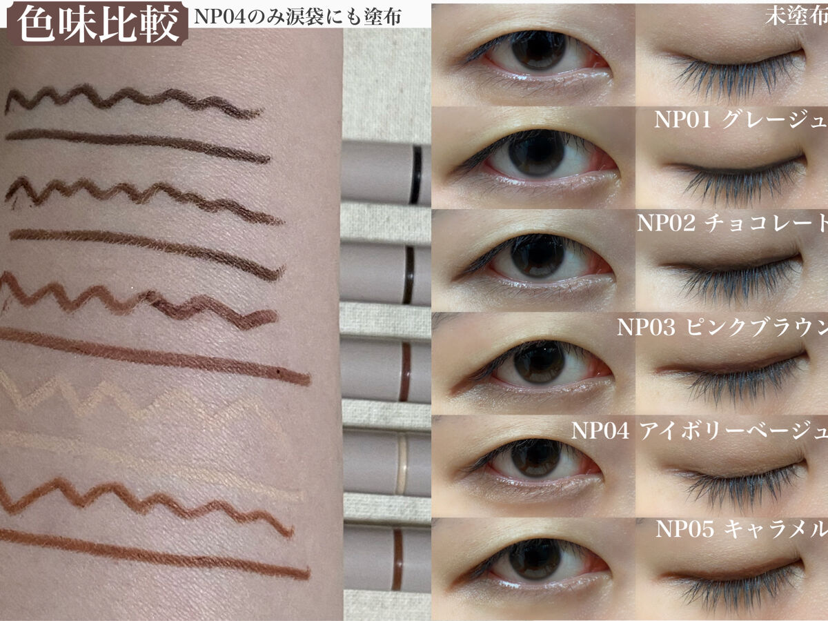まさかのリキッドより落ちにくかったペンシルライナー。 目尻ラインと下瞼目尻毎日使ってる。ほんとに落ちにくいし、芯の硬さも丁度いい。 NP01のグレージュがシリーズの中で1番暗いカラーだよ。一本使い切ったからリピ! 黒みたいに濃すぎず瞳の色と馴染むから使いやすい!