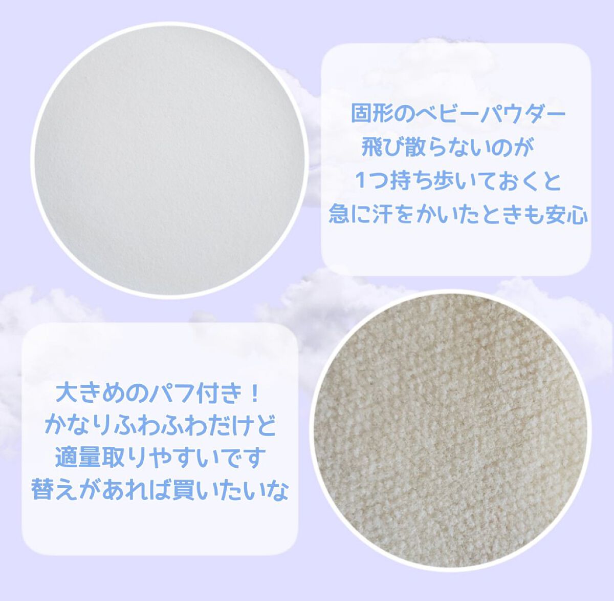 - 医薬部外品 ベビーのやわらかな肌をさらっと 固形のベビーパウダー。 あせも、ただれ、おむつかぶれ、股ずれを防ぎ、赤ちゃんの肌をすこやかに保ちます。 パウダーの飛び散りが少ない、固形タイプなので、携帯にも便利。 パフ内蔵。 使用方法 ●入浴後や、おむつの取り替え、汗ばむときなどにベビーローションなどで肌を清潔にしたあと、添付のパフで軽くおさえるようにしてお使いください。