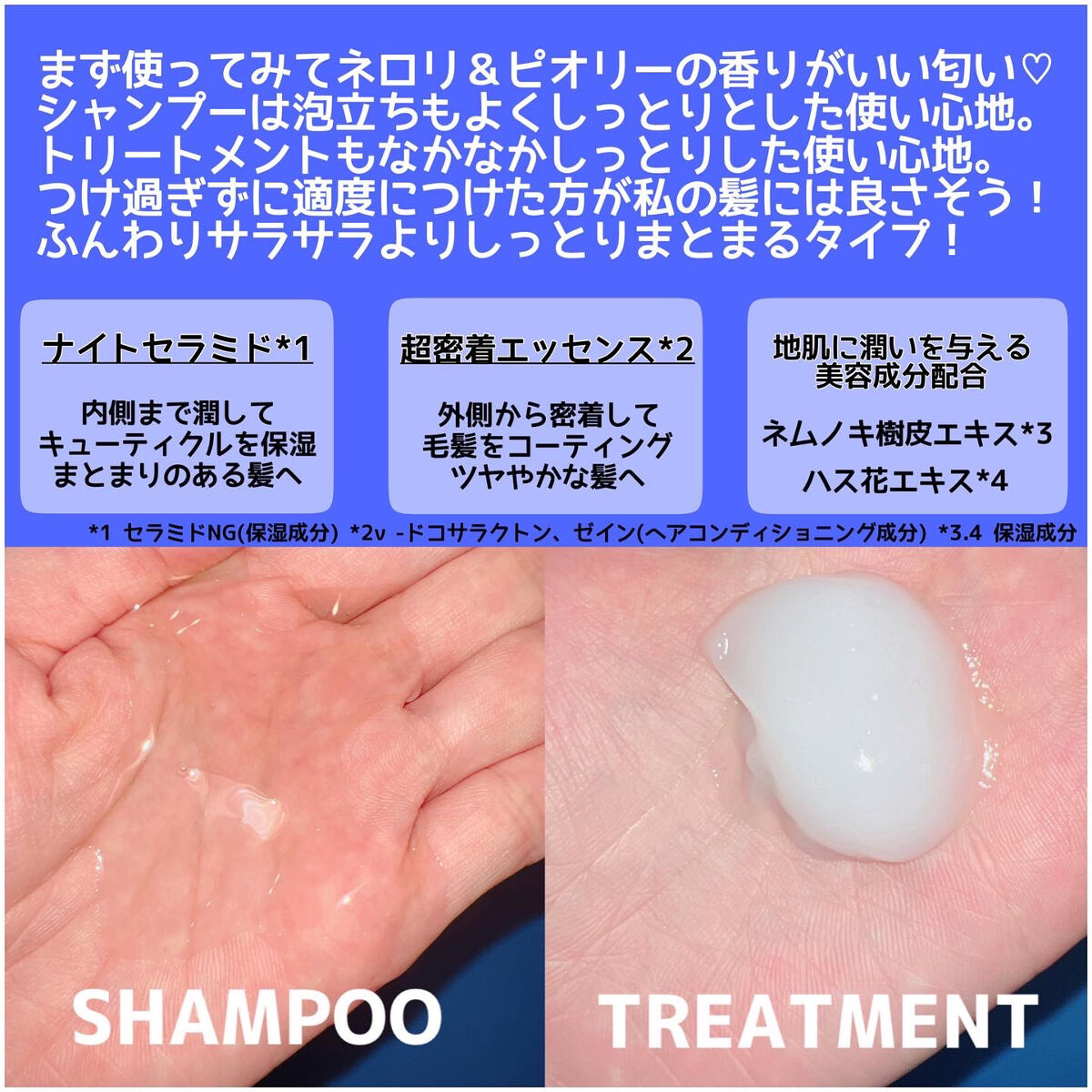 - ダメージリスクは日中だけでなく、夜にも。髪と地肌の濃密ナイトケアで、しっとりうるツヤ髪へ。 ナイトキャップ処方で睡眠中の摩擦・乾燥ダメージから髪を守り、地肌に潤いを与える美容液成分配合。 シャンプー:シリコン、パラベン、鉱物油、合成着色料フリー トリートメント:パラベン、鉱物油、合成着色料フリー ◎ネロリ&ピオニーの香り