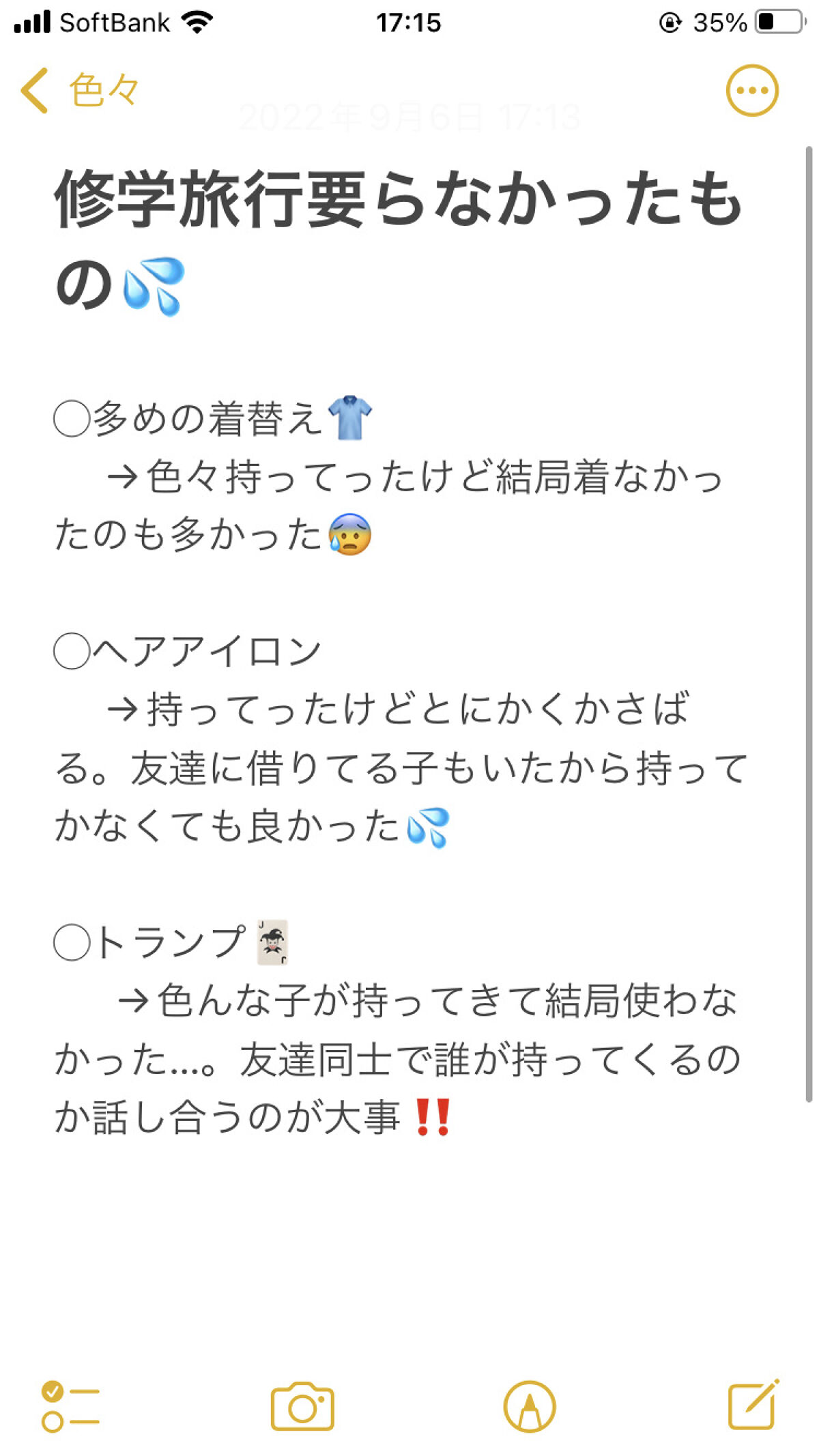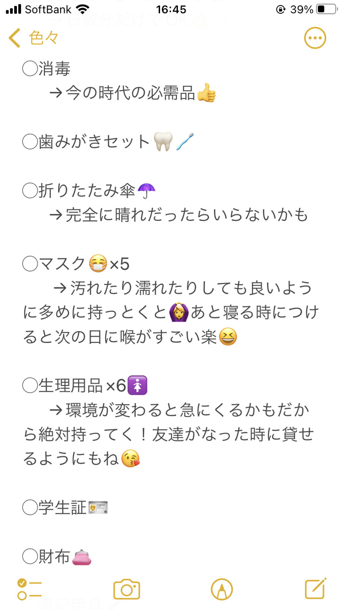 修学旅行持ち物リスト🚌色んなとこに行く人いると思うけど、王道のものをかき集めてみた!服or制服下着靴下タオルハンカチもinpouch!リップマスク予備沢山持っとこ!ビューラー薬女の子の日グッツバンドクリームウエットティッシュちょっとした小銭も...