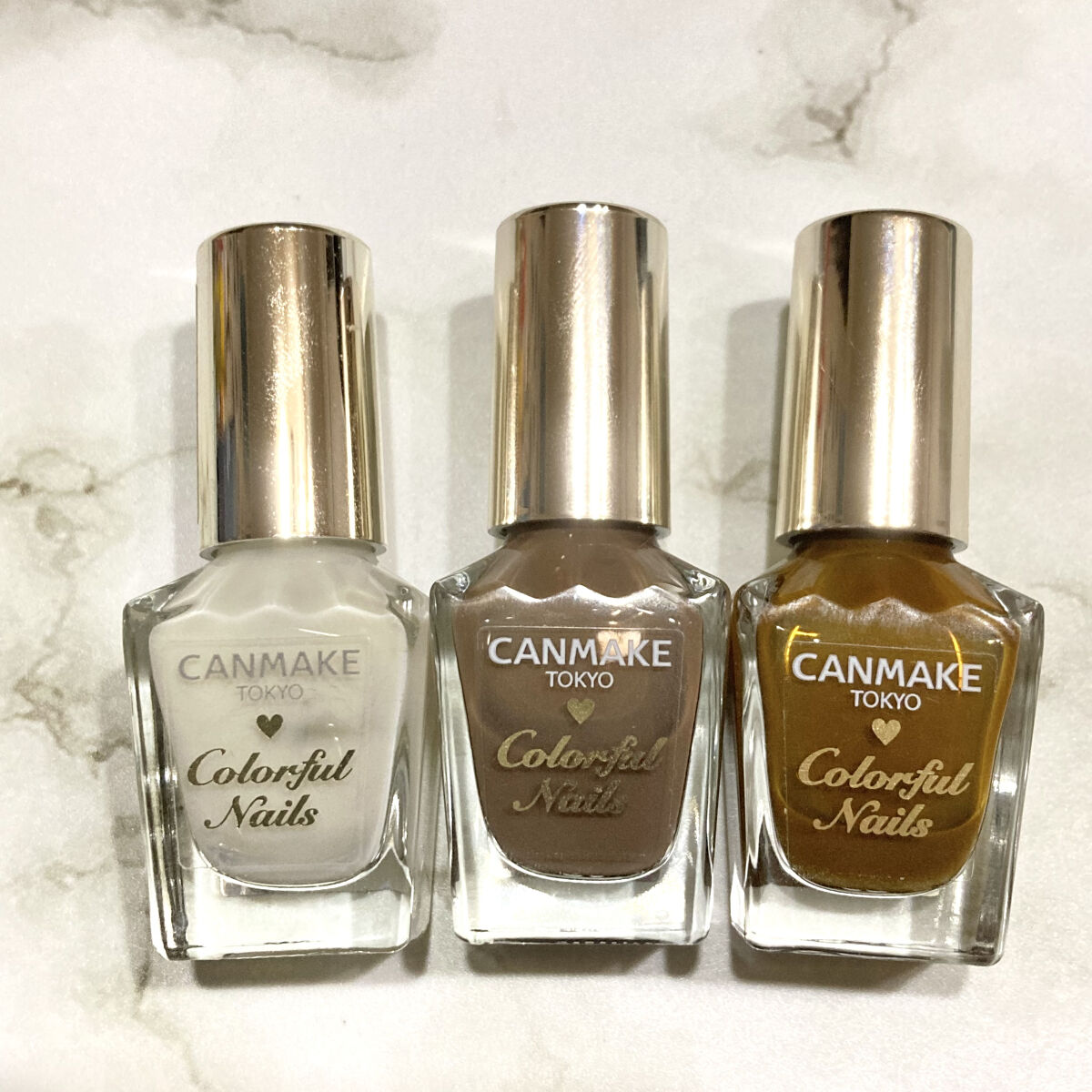 #大人のモカネイル図鑑 🍂使用アイテム キャンメイクカラフルネイルズ N29ミルクシロップ N72マロングラッセ N74クレームブリュレ ラメ ちふれネイルエナメル細筆タイプ 006ゴールド系ラメ細筆 マニキュアですがチップに塗ってます💅 ...