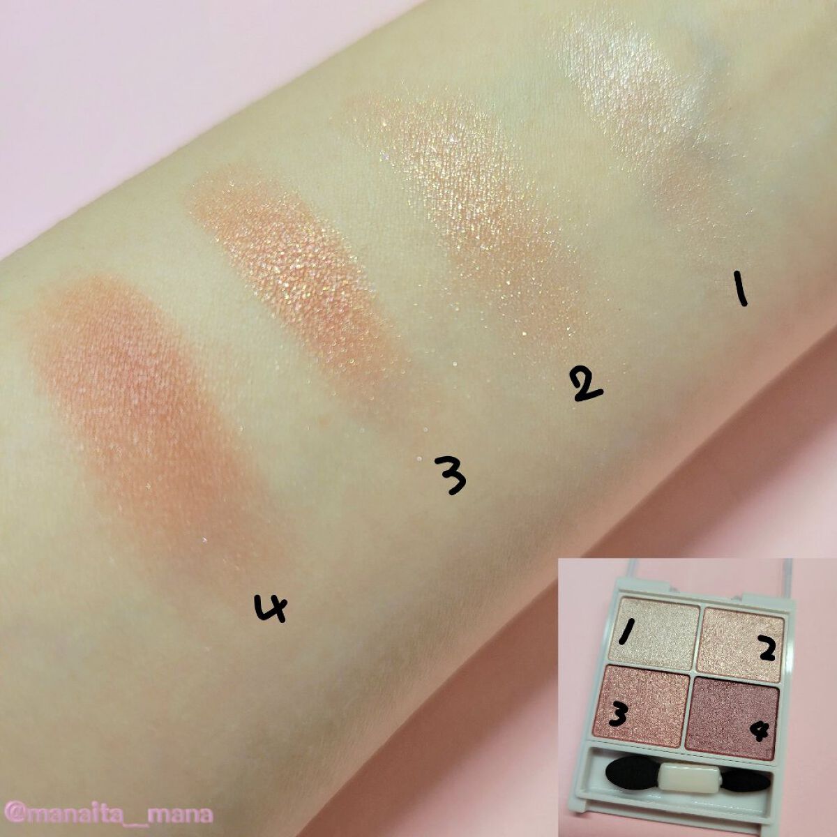 ラメが繊細で可愛い どれも絶妙な赤みのあるカラー 柔らかい粉質で一度塗りで高発色 力を入れなくてもするする書ける。目蓋に優しそう 若干ピンク感。ピンクブラウン?ピンクアッシュ? 擦ってもびくともしない