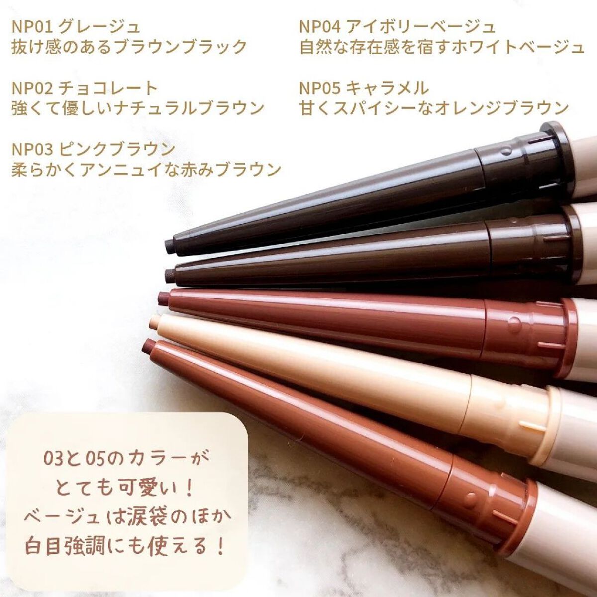 - 濃淡自在のやわらか発色で、夜まで落ちないクリーミーペンシルライナー。目元に馴染む自然な発色で、濃くも薄くも調節自在です。 とろけるような描き心地の極細1.5mm芯で、目のキワにもやさしいタッチでするする描けます。 ウォータープルーフ&スマッジプルーフの耐久処方で、美発色をキープします。 目元をケアする美容液成分(パンテノール、ヒアルロン酸*、センブリエキス ※すべて保湿)を配合しました。 目元の印象を濃くしすぎない、抜け感のある5色のニュアンスカラー。 目元を自然に際立てるやわらかな発色にこだわり、メイク初心者の方にも、普段アイライナーを使わない方にも手に取っていただきたいアイテムとなっております。 繰り戻し可能なスリムペンシルです。 * ヒアルロン酸Na