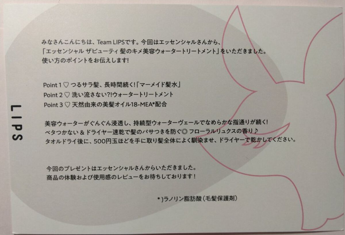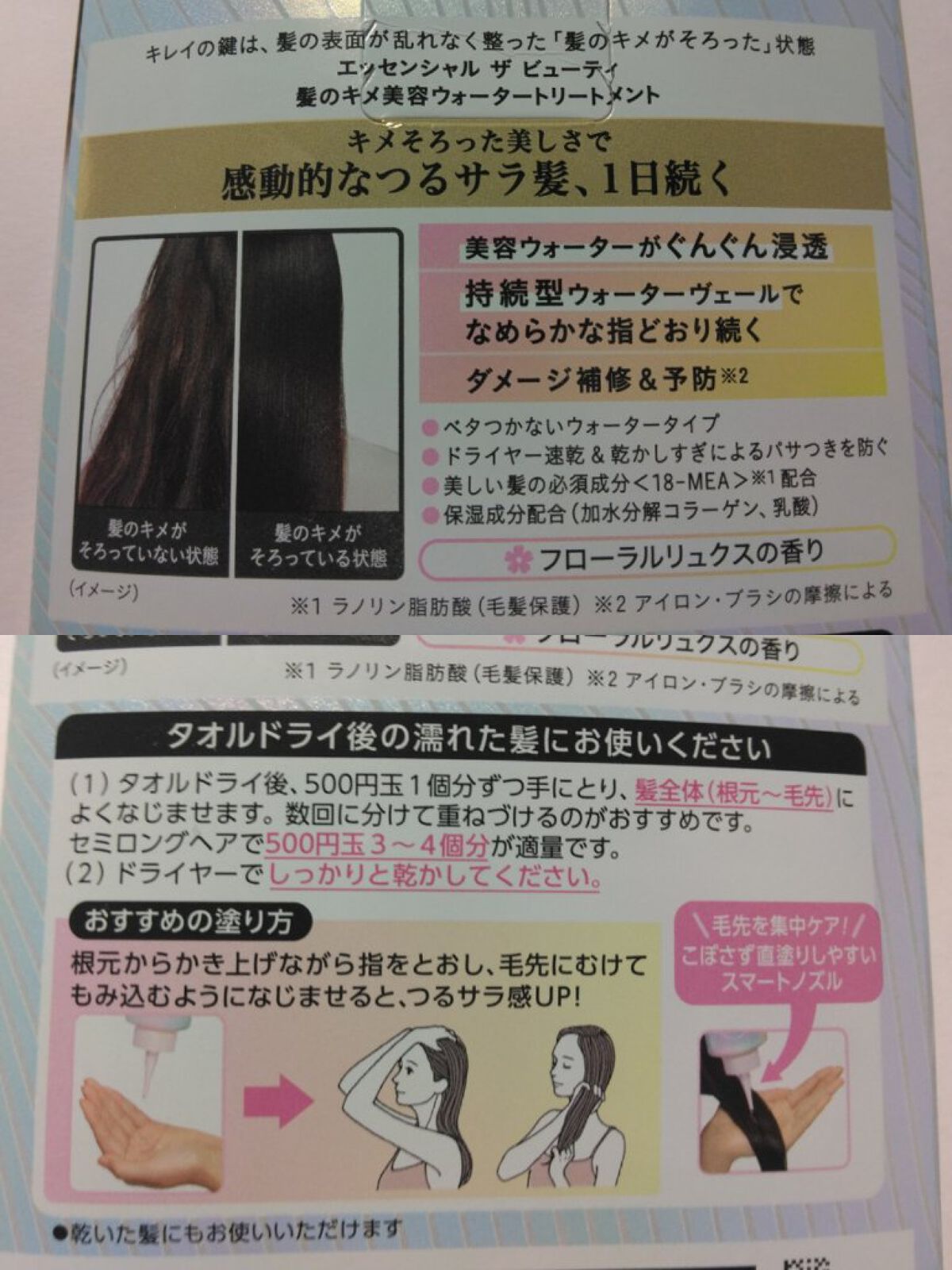 エッセンシャルプレミアムウォータートリートメントナチュラルモイスト口コミ評価が高くて気になってたエッセンシャルのウォータートリートメントを使ってみました!【使い方】①タオルドライ後、500円玉1個分ずつ手に取り髪全体によくなじませます。(セミ...