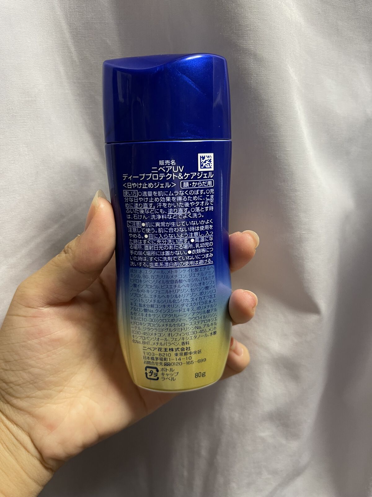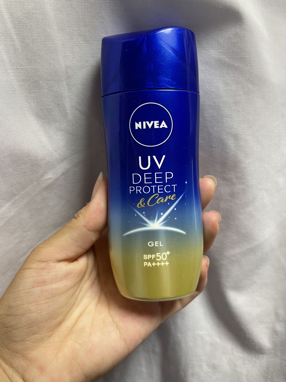 ニベアUV ディープ プロテクト&ケア ジェルは、予防美容(日焼けによるシミ予防)ができるという美容ケアUV商品で、SPF50+、PA++++となっています。 乾燥による小じわを目立たなくする美容液成分配合で、日焼けによるシミ、そばかすを防ぎながら肌に潤いまで与えてくれます。 スーパーウォータープルーフ仕様となっています。