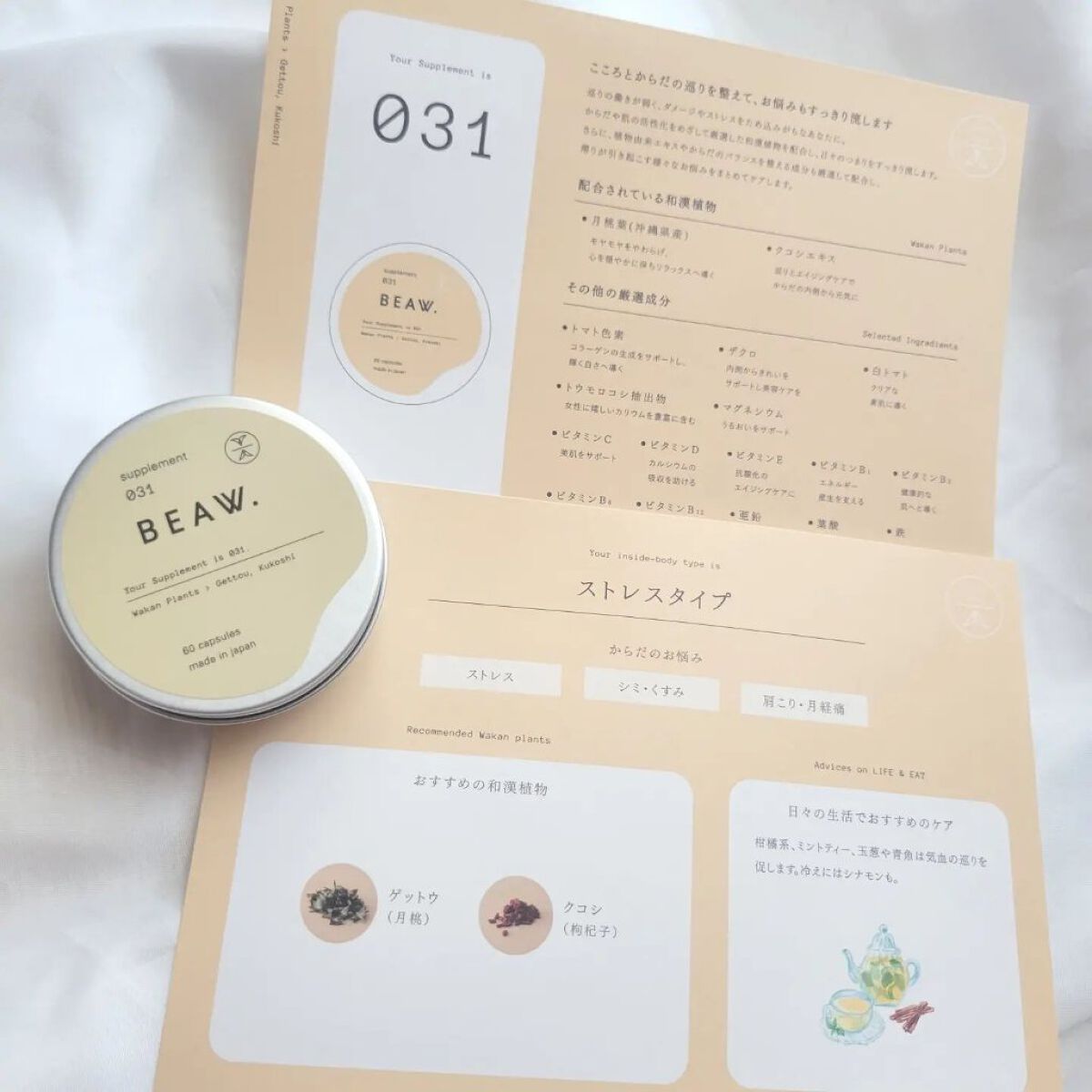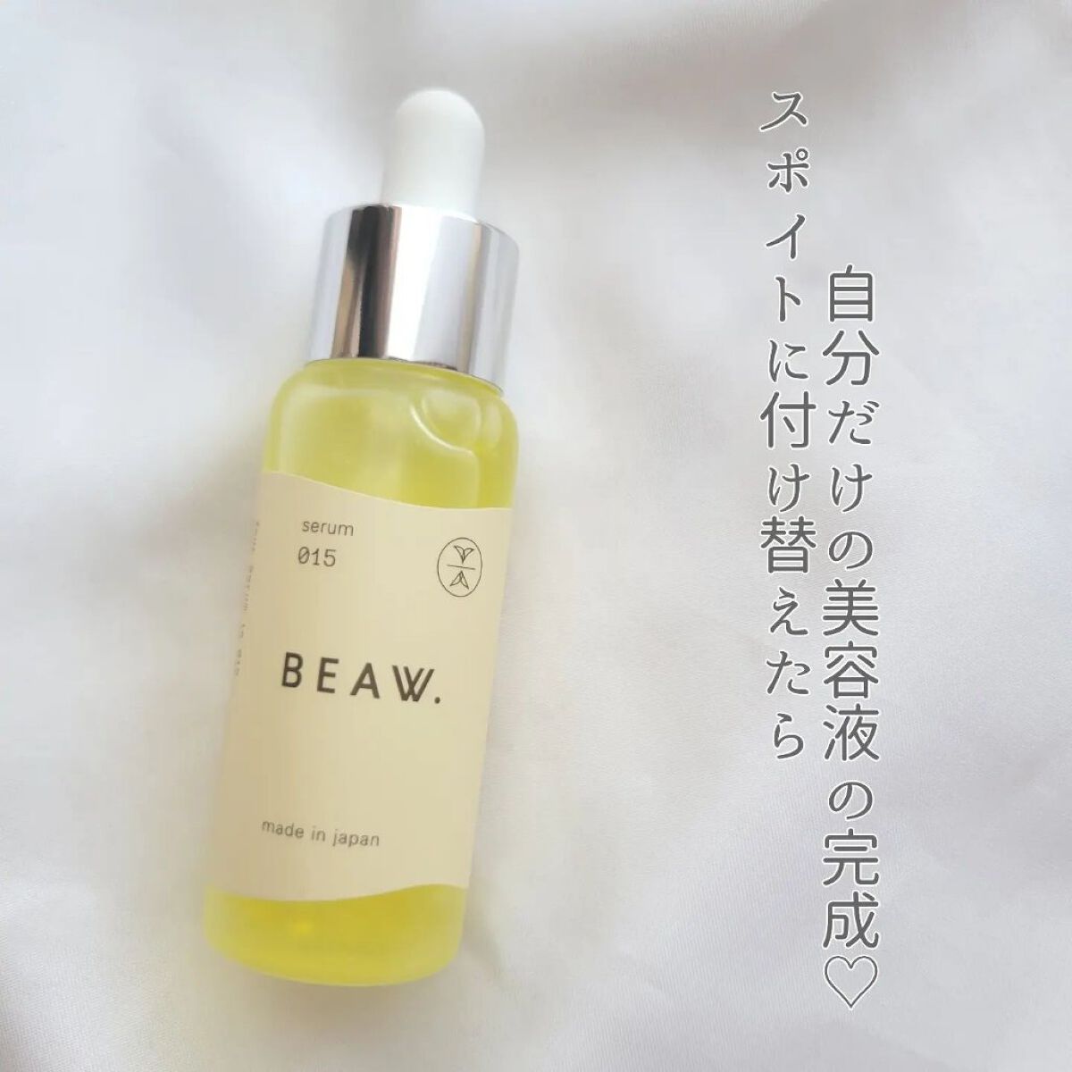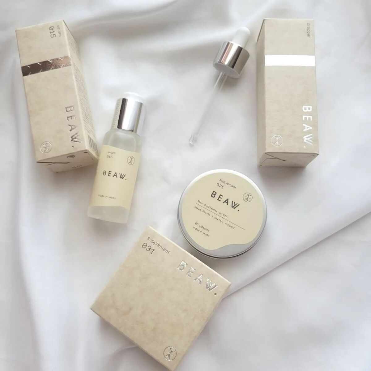 ・BEAW.のパーソナライズケアは始めにパーソナライズ診断を行い、20種類の和漢と、自然由来の保湿成分の組み合わせから、一人ひとりに合わせた製品をお届けします。 ・現在の自分の悩みにぴったりのパーソナルケアキット、和漢植物由来成分を配合した2剤式のセラムとサプリメントのセットでお届けします。からだの内と外から同時に理想の美しさをめざせるデュアルケアで、あなたの美容をサポートします。 ・美容液は、肌荒れ予防、乾燥、毛穴、テカリ、くすみ*、年齢肌、ツヤ肌、などその人それぞれの悩みに対して適した処方で国産和漢植物成分と、植物エキス、ビタミンやセラミド、プラセンタ、ナイアシンアミド、などを配合した保湿成分を分析結果に合わせて配合。*乾燥による ・サプリメントは体の内側からキレイをサポートする国産和漢植物成分と20種類以上のビタミン、ミネラルをそれぞれに合わせて配合。 -対象商品- BEAW.リッチセラム003、008、015 BEAW.サプリメント:001、007、031 BEAW.フェイスウォッシュ:019、026、045 -内容量- BEAW.リッチセラム:30ml BEAW.サプリメント:60粒 BEAW.フェイスウォッシュ:80g