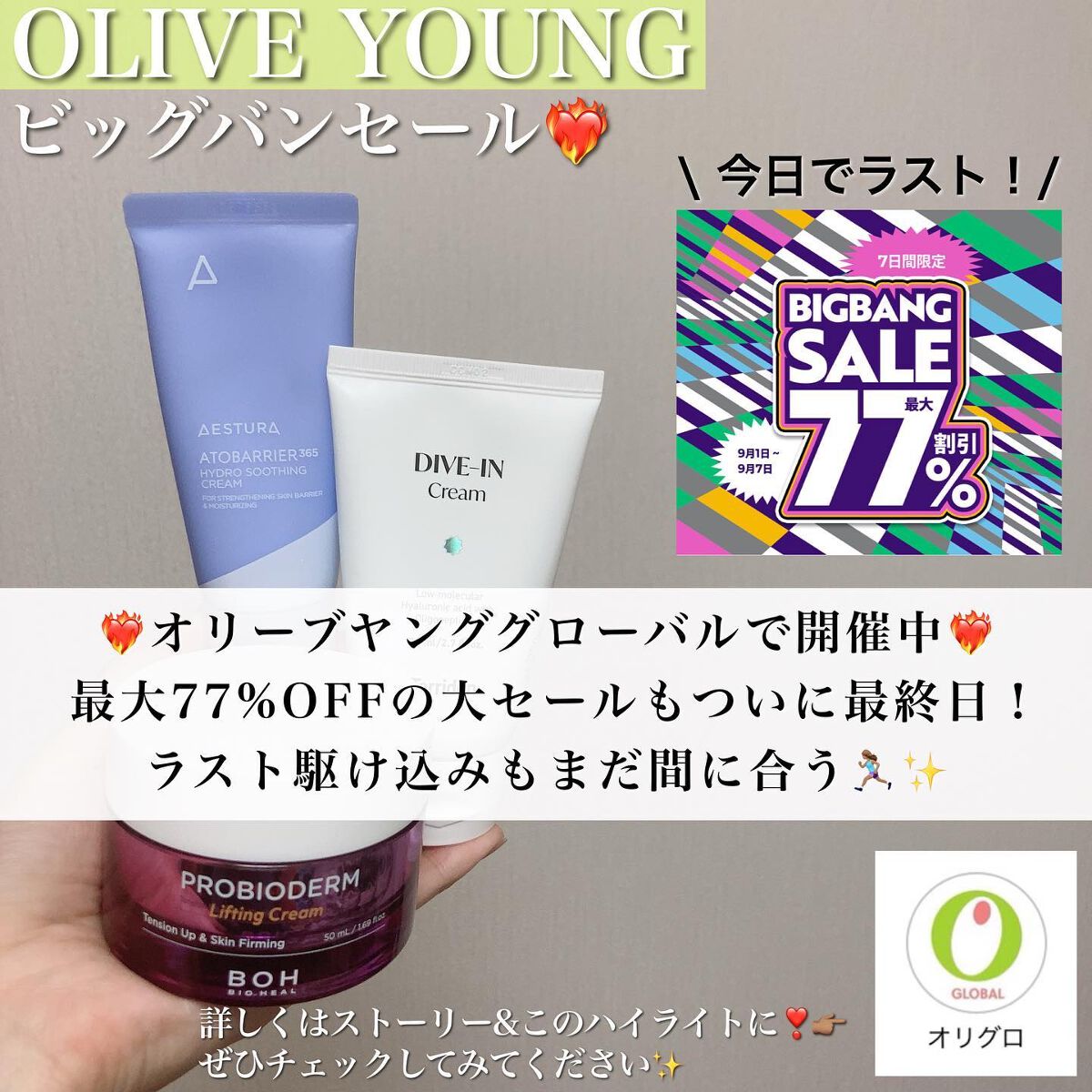 オリグロビッグバンセールもついに今日が最終日、、!🥹寂 人気アイテムが爆裂お得にゲットできるこのチャンスを逃す手はなしっ❤️🔥❤️🔥❤️🔥 @oliveyoung_global では9/1〜9/7まで最大77%OFFのビッグバンセール開催中❤️🔥❤️🔥❤️🔥 さらにイベント中の7日間限定で使える55〜60%OFFクーポンもあります!🫣 @tsuna_mom271プロフィールリンクからオリーブヤンググローバル新規登録で次回のお買い物に使える10%OFFクーポンがもらえます❤️🔥 ◎新規登録で5ポイント(5ドル相当)◎アプリDLで5ポイント(5ドル相当)の10ポイント(10ドル相当)も付与✨ 私のおすすめアイテムはストーリーに随時更新してます🤍 オリーブヤンググローバルの商品購入時のプロモーションコード欄に𓊆 TSUNA271 𓊇で5%OFFになります🕊𓂃 𓈒𓏸◌
