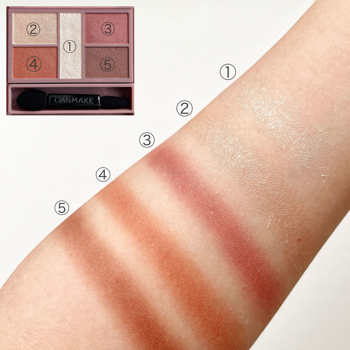 - 1枚のパレットで2つのスタイルが完成! 5色の欲ばりアイシャドウ♥ メインカラーを選んで2つのスタイルが楽しめる! A→B→D でスタイル1 A→C→D でスタイル2 繊細な粉質が、しっとりとまぶたに密着して色落ちを防ぎます。 透明感のあるキラうるトッピングジュエル(繊細ラメ)は、気分によってトッピング!