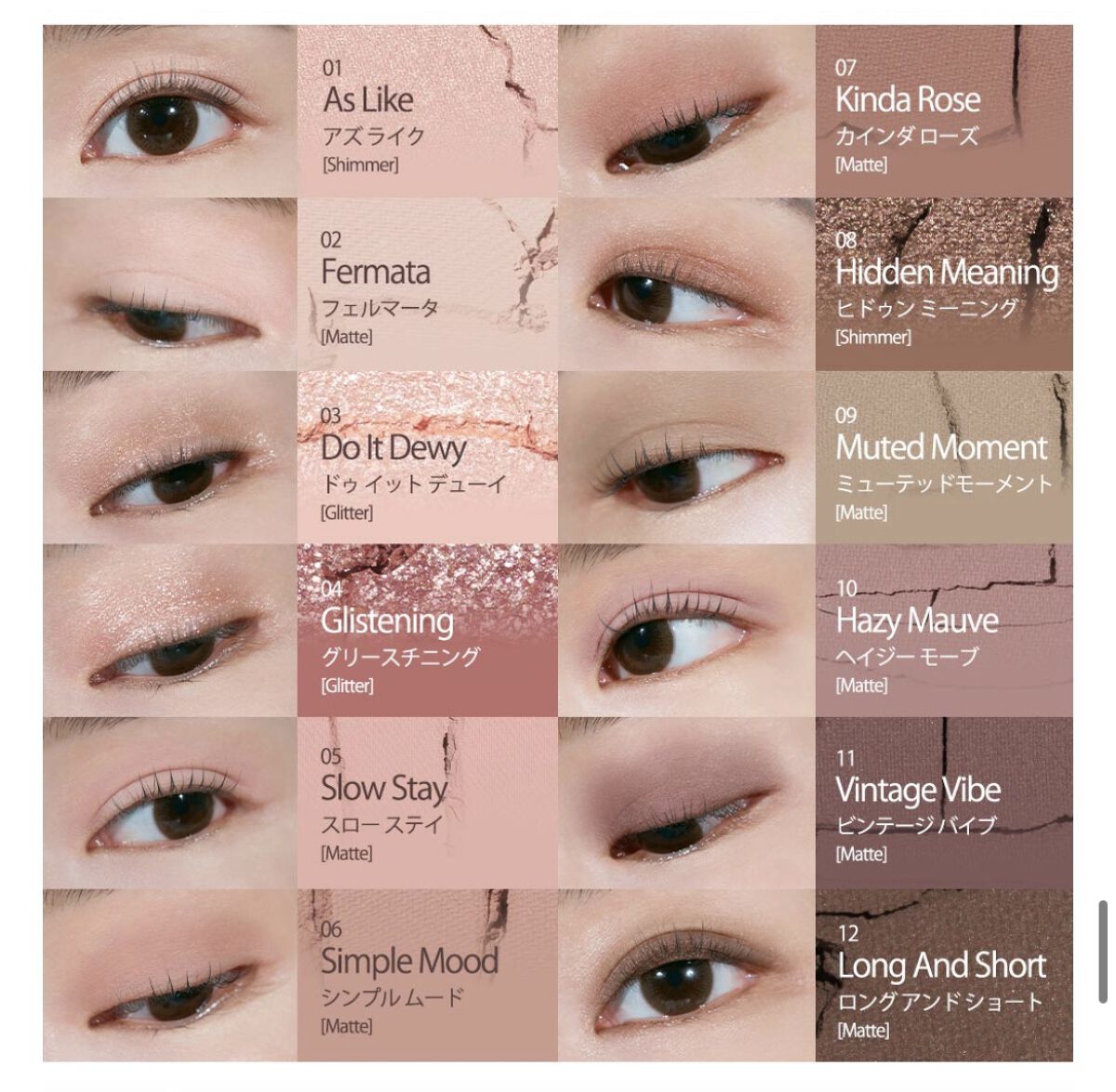 結論、イエベでも浮かず、あざのようなカラーにもならず綺麗に発色してくれました😭 マット、シマー、グリッターカラーが入ってますがマットカラーは溶け込むように綺麗に色がついてくれて浮くことなく発色してくれます! またグリッターはザクザクなのにピタッと乗ってくれて、キラッキラです😍 クリオのラメ、上品かつ華やかにキラキラさせてくれるので大好きです!!!!! 薄い色のグリッターは涙袋にぴったり濃い色のグリッターは上瞼に重ねてあげるとマットカラーや下地の色を邪魔せず、でもぐっと華やかにしてくれました! ハイライト、チーク、シェーディングとしても使えるカラーも入ってますので、これ一つあればどこでもいけます!