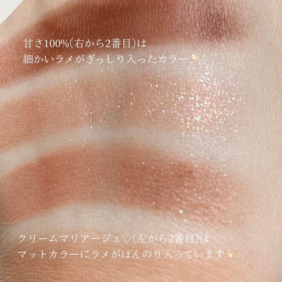 - ひと塗りでムラなくまぶたに密着、異なる質感のカラーが美しく高発色。 4色のアイシャドウを重ねるだけで簡単に深みのあるグラデーションが完成! マット質感なビスケットカラーとなめらか質感なクリームカラーグリッターの組み合わせで、目元の印象をカジュアルにもゴージャスにも演出できちゃう♡