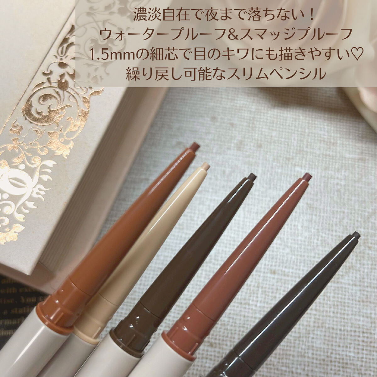- 濃淡自在のやわらか発色で、夜まで落ちないクリーミーペンシルライナー。目元に馴染む自然な発色で、濃くも薄くも調節自在です。 とろけるような描き心地の極細1.5mm芯で、目のキワにもやさしいタッチでするする描けます。 ウォータープルーフ&スマッジプルーフの耐久処方で、美発色をキープします。 目元をケアする美容液成分(パンテノール、ヒアルロン酸*、センブリエキス ※すべて保湿)を配合しました。 目元の印象を濃くしすぎない、抜け感のある5色のニュアンスカラー。 目元を自然に際立てるやわらかな発色にこだわり、メイク初心者の方にも、普段アイライナーを使わない方にも手に取っていただきたいアイテムとなっております。 繰り戻し可能なスリムペンシルです。 * ヒアルロン酸Na