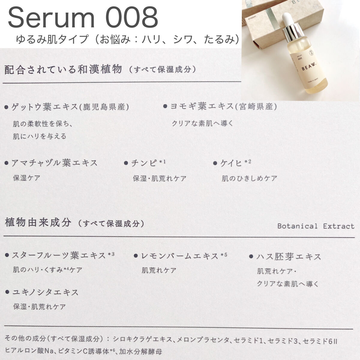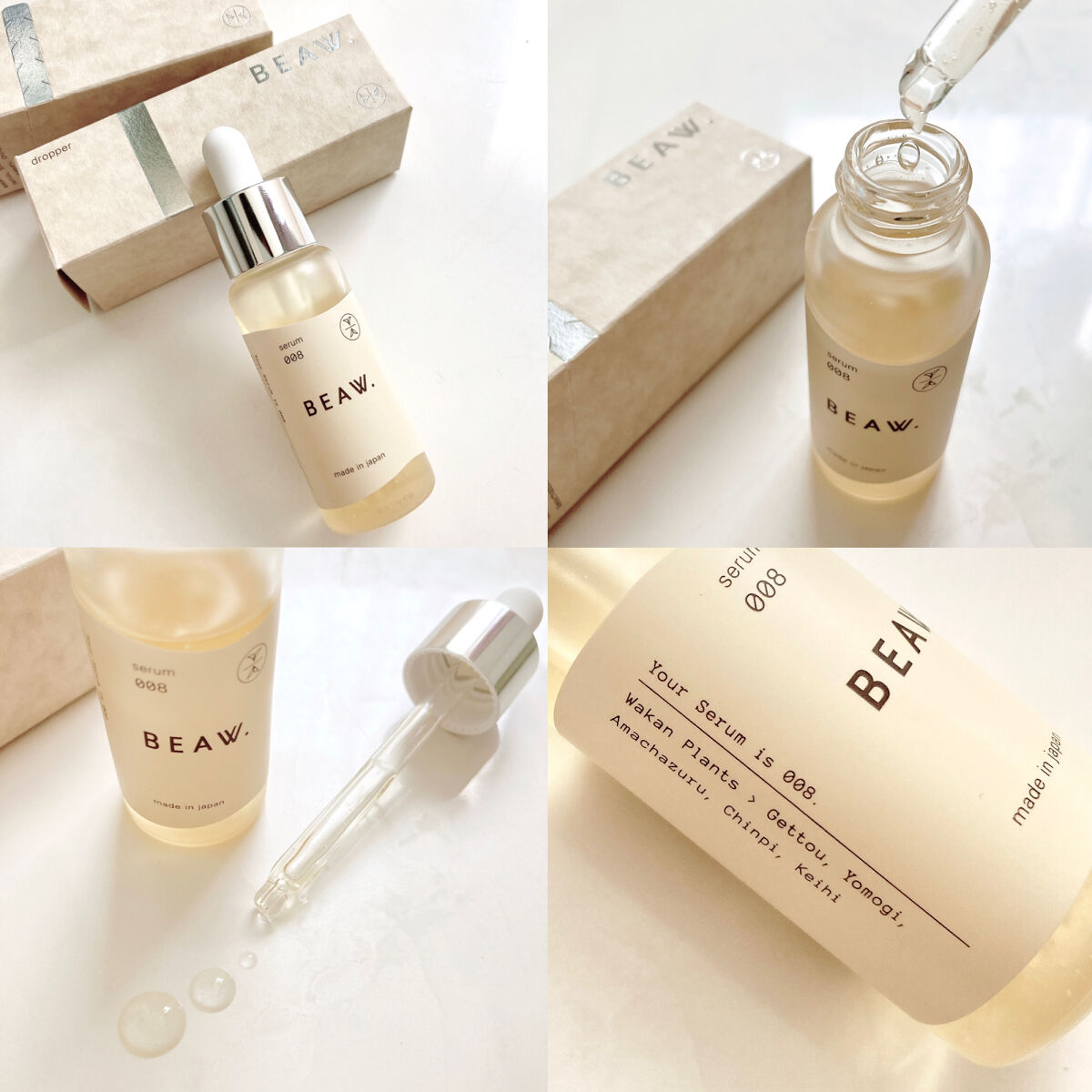 - ・BEAW.のパーソナライズケアは始めにパーソナライズ診断を行い、20種類の和漢と、自然由来の保湿成分の組み合わせから、一人ひとりに合わせた製品をお届けします。 ・現在の自分の悩みにぴったりのパーソナルケアキット、和漢植物由来成分を配合した2剤式のセラムとサプリメントのセットでお届けします。からだの内と外から同時に理想の美しさをめざせるデュアルケアで、あなたの美容をサポートします。 ・美容液は、肌荒れ予防、乾燥、毛穴、テカリ、くすみ*、年齢肌、ツヤ肌、などその人それぞれの悩みに対して適した処方で国産和漢植物成分と、植物エキス、ビタミンやセラミド、プラセンタ、ナイアシンアミド、などを配合した保湿成分を分析結果に合わせて配合。*乾燥による ・サプリメントは体の内側からキレイをサポートする国産和漢植物成分と20種類以上のビタミン、ミネラルをそれぞれに合わせて配合。 -対象商品- BEAW.リッチセラム003、008、015 BEAW.サプリメント:001、007、031 BEAW.フェイスウォッシュ:019、026、045 -内容量- BEAW.リッチセラム:30ml BEAW.サプリメント:60粒 BEAW.フェイスウォッシュ:80g