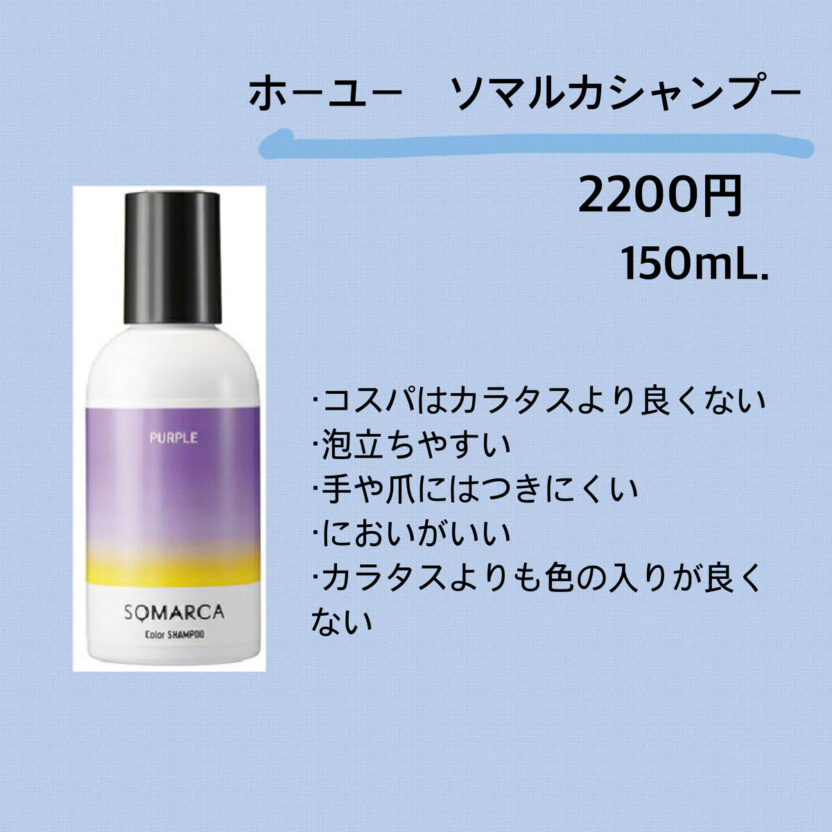 カラタスシャンプーはインスタとかでよく見かけるので一般的に人気の高い商品ですよね 手や爪に色がつきやすいので、その分しっかり黄ばみを抑えてくれます ソマルカシャンプーはあまりコスパが良くないです、、、🥹🥹 でもにおいがよく(カラタスよりも好き)、泡立ちやすくて洗いやすいです あまり色が入りにくいので髪の毛が明るい方向けだと感じました😃 私はソマルカシャンプーの方がすきです🫡🎶 ほとんどの期間髪が明るいで、発色加減に落ち度を感じたことはありません リピートしてますっ^_^