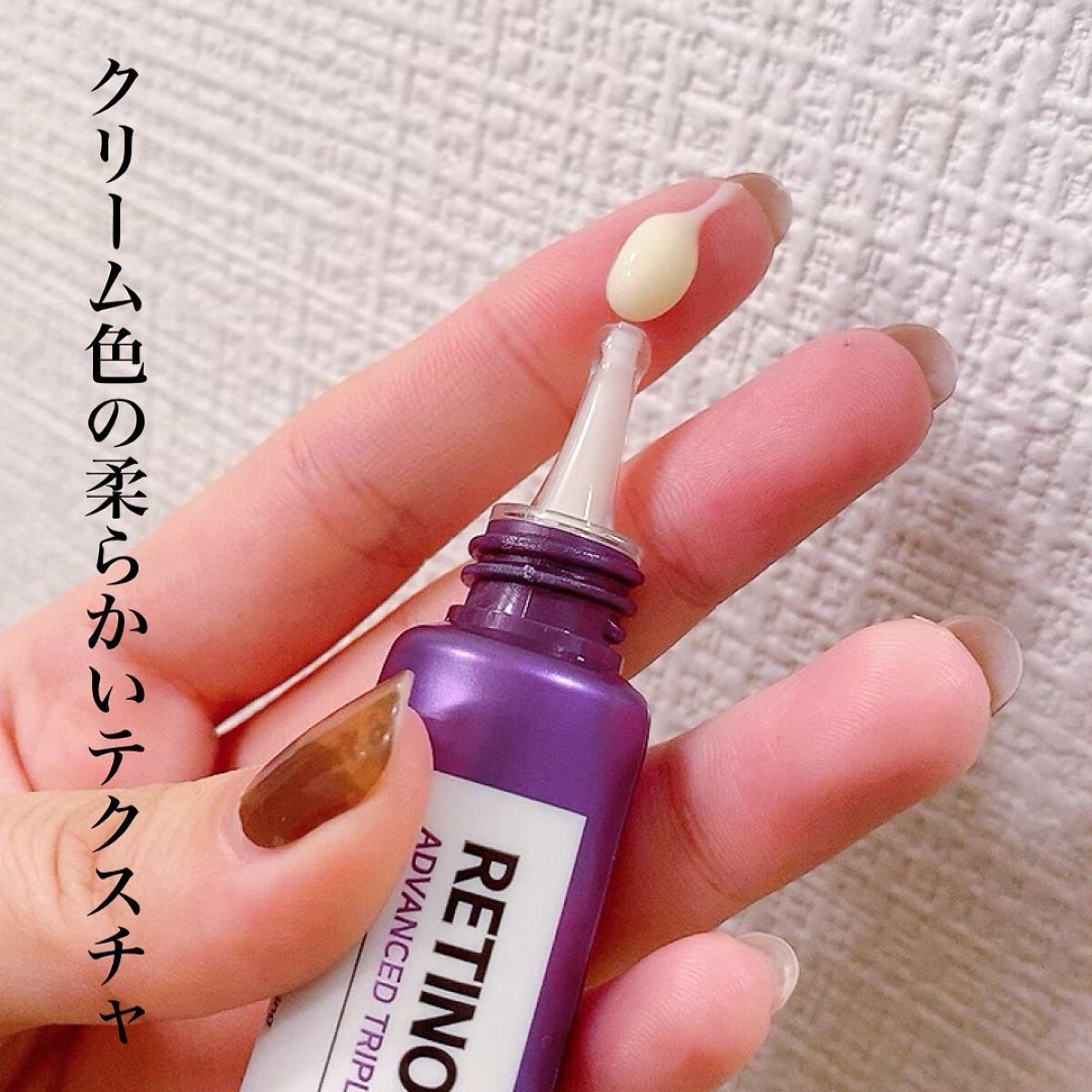 レチノール0.1%+グルタチオン配合で目のくま・小じわを集中ケア 目元以外にも口元や眉間などにも使えて、さまざまなシワ悩みにアプローチしてくれます💜 柔らかくよく伸びるクリームで、結構しっとり感があるような使用感 べたつかずしっかり保湿される使用感なのが嬉しいです💕 この紫パケが特徴的 それぞれの肌に合わせて、使用量などを調整して使うのが大切かなと思います。
