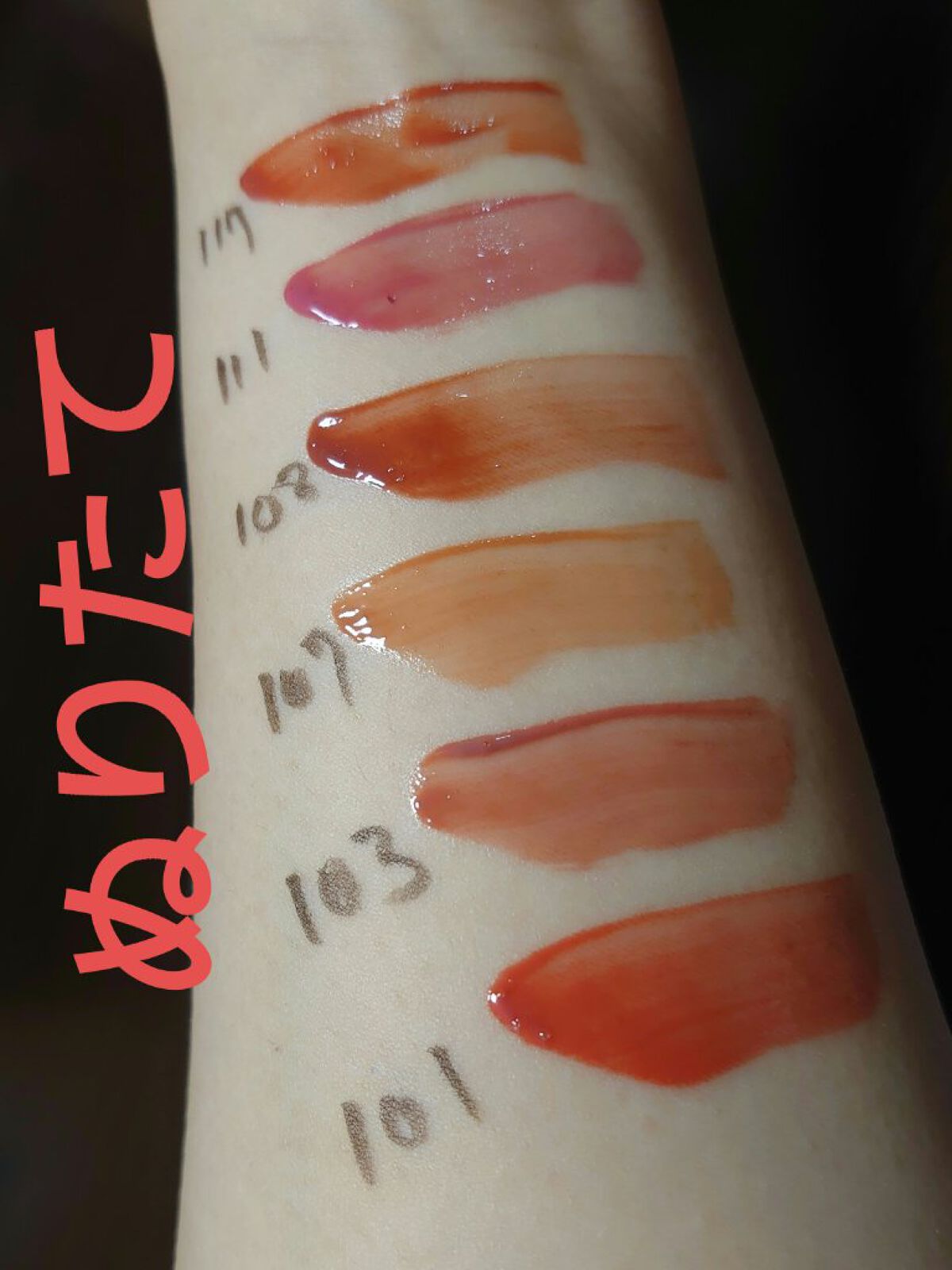 見本画像の色味とは少しちがうかも? いや、一緒かな? でも、全部かわいかった🥰 気に入りすぎて追加購入🤭 ティント効果はしっかりあって、5分位でこの色残りです。 薄付きなリップなのでシーン問わず使えそう🙆 良い点 ・ツヤツヤリップになる ・唇の治安が良くなる(わたしだけ?) ・リンゴ歯磨き粉みたいないい匂い 微妙な点 ・マスク使用時の色持ちはあまり良くない ・見本画像みたいに塗るのは難しい