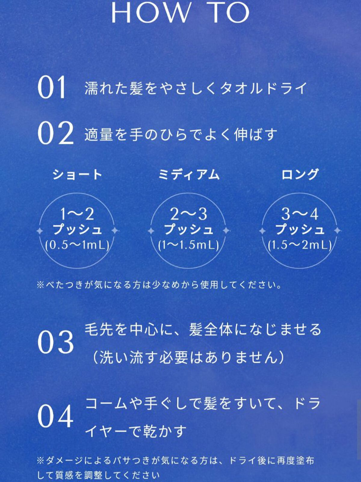 テクスチャーはオイルのような感じではなくジェルに近い感じでした! ジェルなので付けた感じがあまりしなく、初めて使った時は塗りすぎてべたついてしまいました(´^ω^) 肩ちょっと下のミディでだいたい100円玉くらい出したら丁度良かったです👍 うねりやくせは出ず朝髪をセットする時は楽に出来たのでオヌヌメですッ!!!(;´༎ຶٹ༎ຶ`)時間短縮イズザベスト このお試しが使い終わったら通常ボトルを購入しようかなと思うくらい良かったです👍購入します👍