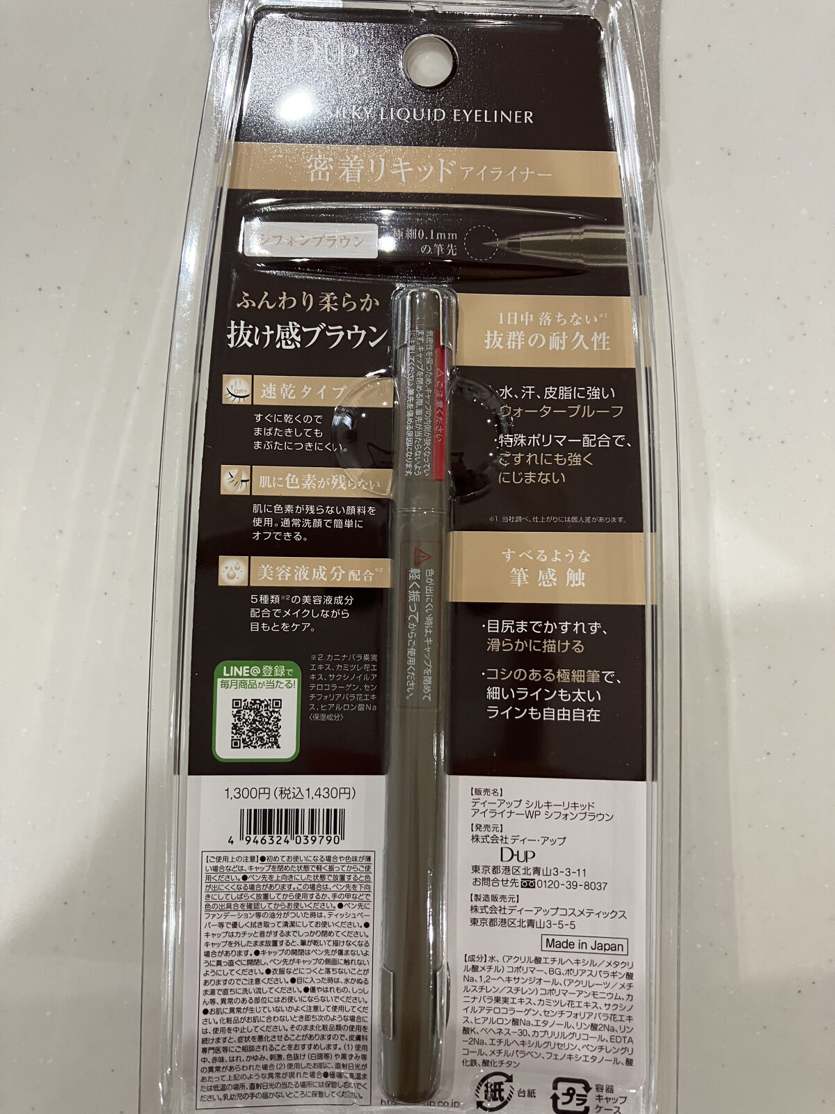 D-UPのアイライナーのブラックとか、ブラウンブラックは、数年前まで何本もリピ買いして超愛用してたんだけど、今回、初めてシフォンブラウンを購入! 筆は適度なコシがあって描きやすいし、なんといっても色味がめちゃくちゃ可愛い♡ 8/1に発売された新色のピーチモカも超可愛くて、欲しい…どうしよう…ってなってる。