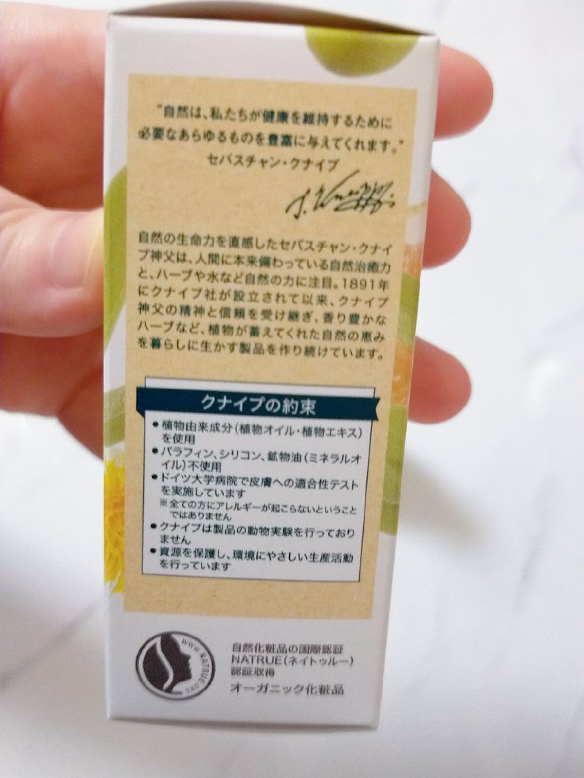 - パッケージがナチュラルで洗練された雰囲気にリニューアル。 オーガニック保湿ケアオイルで、なめらか肌に。 お顔だけでなく全身に使える保湿ケアオイル。 100%天然由来植物成分配合。スッと肌になじみます。 植物の恵みでやさしく潤し、肌本来のもつ力をサポートします。 さわやかな天然のグレープフルーツの香りで気分リフレッシュ。 ●オーガニック国際認証 NATRUE(ネイトゥルー)取得 「NATRUE」は自然・オーガニック化粧品に関する厳格な維持を目的として2007年に設立された国際的な非営利団体です。 クナイプビオ オイルは、「NATRUE」の中でも最高ランクである「オーガニック化粧品」の認証を取得しています。