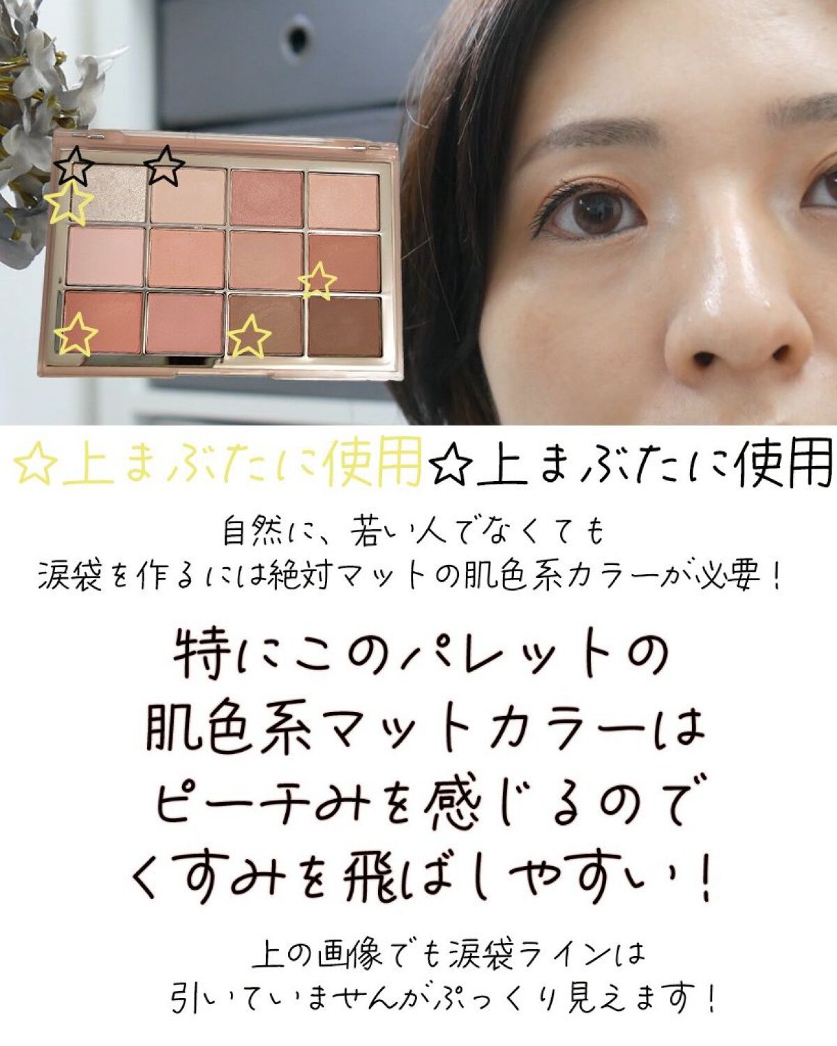 ☑韓国インフルエンサーのこだわりカラー ☑しっとり密着持ちがいい ☑ラメが派手すぎない ☑ふんわりブラウンが小悪魔的な可愛さにしてくれて盛れる♡ かなり明るいカラーなので、肌が白めでないと発色しない可能性がある。白めでない場合は、同じシリーズのもう少し濃いめのパレットをおすすめします! 藤田ニコルさんのYoutubeでも盛れるメイクでこのパレットを使用していました!ベースカラーと上の明るい色のラメを使っていたと思います!ナチュラルメイクやモテメイク、小悪魔的なメイクに向いていると思います!