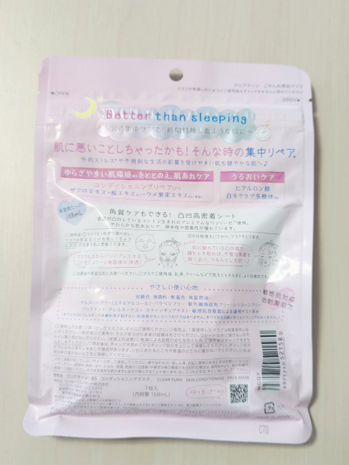 - 【クリアターン ごめんね素肌マスク】 負担をかけて、あれてしまった肌の素肌環境※1をととのえる“速攻集中リペア※2マスク”です。 ① あれがちな肌を素早くコンディションケア! ザクロエキス、桜エキス※3、ウメ果実エキスBG配合し、ゆらぎやすい肌環境をととのえ、肌あれをケアします。また、うるおいケア成分として、ヒアルロン酸、白キクラゲ多糖体BGを配合。外的ストレス※4や不規則な生活の影響を受けやすい肌も健やかでゆらぎにくい肌へみちびきます。 ②敏感肌も使える、弱酸性・低刺激処方 無香料・無着色・無鉱物油・アルコールフリー(エチルアルコール)・パラベンフリー・紫外線吸収剤フリー・シリコーンフリー・パッチテスト済み・アレルギーテスト済み・スティンギングテスト済み・敏感肌自覚者による連用テスト済み(すべての方にアレルギーや皮膚刺激が起きない、刺激感がないというわけではありません。すべての方の肌に合うということではありません。) ③角質ケアもできる!凸凹高密着シート コットン生まれのやわらかな肌触りのベンリーゼを使用。 表面に凸凹のエンボス加工を施しているため、密着性が高く、はがしたマスクでやさしく顔をふきとることで角質ケアもできます。 ※1 うるおい環境のこと ※2 うるおいお手入れのこと ※3 ソメイヨシノ葉エキス、ウメ果実エキスBGはウメ果実エキス・BG(保湿) ※4 乾燥による刺激のこと