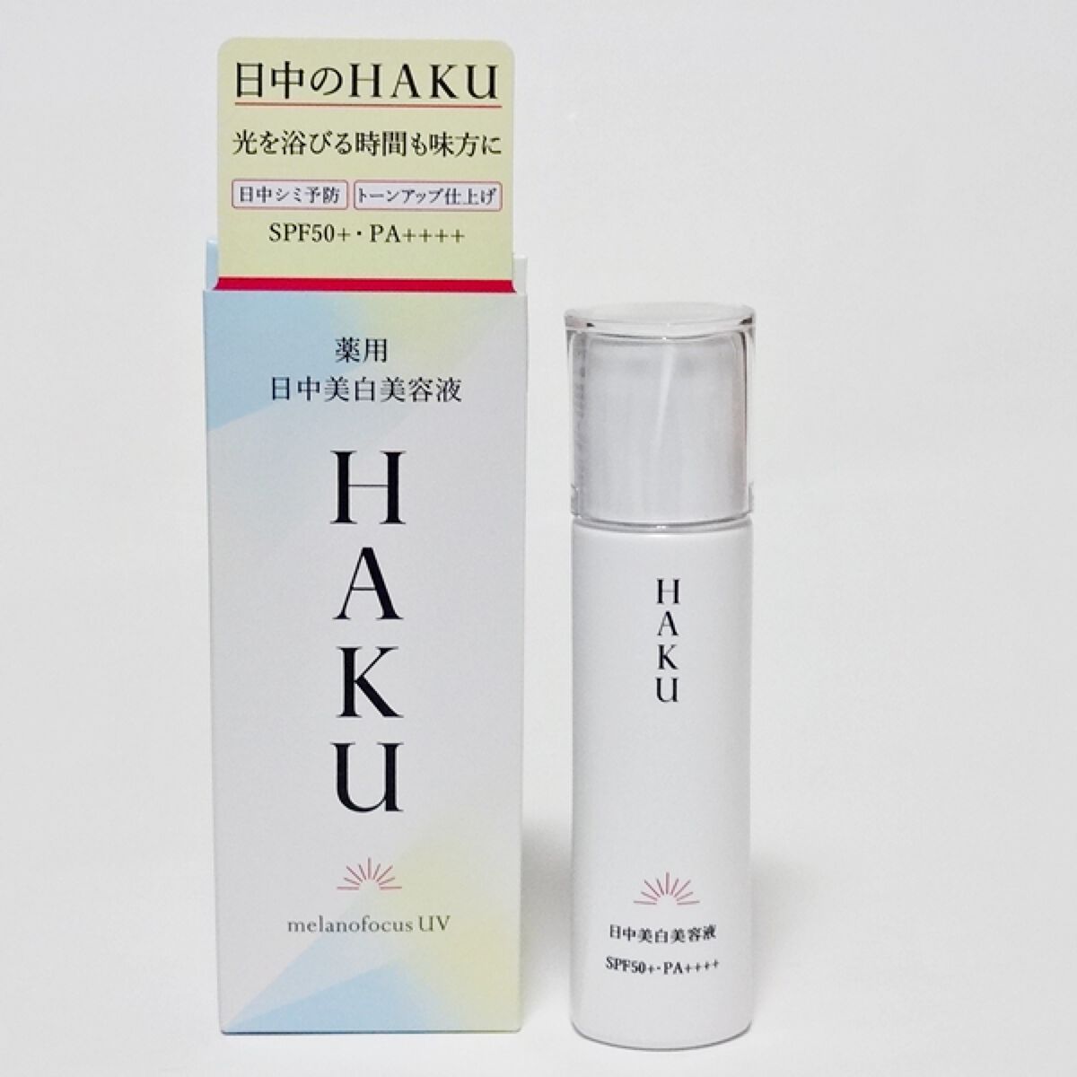 - 販売名「メラノフォーカスUV」 SPF50+・PA++++ 日中のHAKU。光を浴びる時間も味方に、日中だからできる美白ケアのアプローチ。 シミ予防研究の先端技術を搭載し、日中ならではの美白ケアを可能にした、薬用日中美白美容液です。光を浴びる時間も味方にして、明るく透明感のある肌に導きます。 ○2種の美白有効成分を肌の奥まで届け効かせる。 ○日中の肌環境に着目し、Wデイエフェクターを配合。うるおいを与え届ける。 〇ファインレッドパールαが効果的に光を放ち、シミや色ムラを目立たせない。トーンアップ効果で、明るく透明感のある仕上がり。 〇みずみずしい美容液がスーッとなじむ。化粧下地としても使える。 ○無香料・アレルギーテスト済み・ニキビのもとになりにくい処方。 (全てのかたにアレルギーが起きない、ニキビができないというわけではありません)。