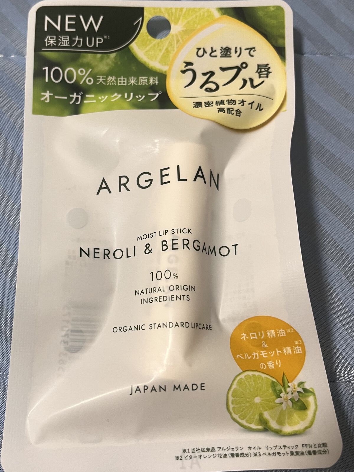 香りはネロリとベルガモットの精油配合のシトラス系です。いい香りで癒される…。 色味は、「クールな透明感にかわいさを秘めた青みピンク」とパッケージに書いてあります。 唇は1回塗りでうるうるつやつやに、発色もよいです。アルジェラン、やっぱり大好きだ…。