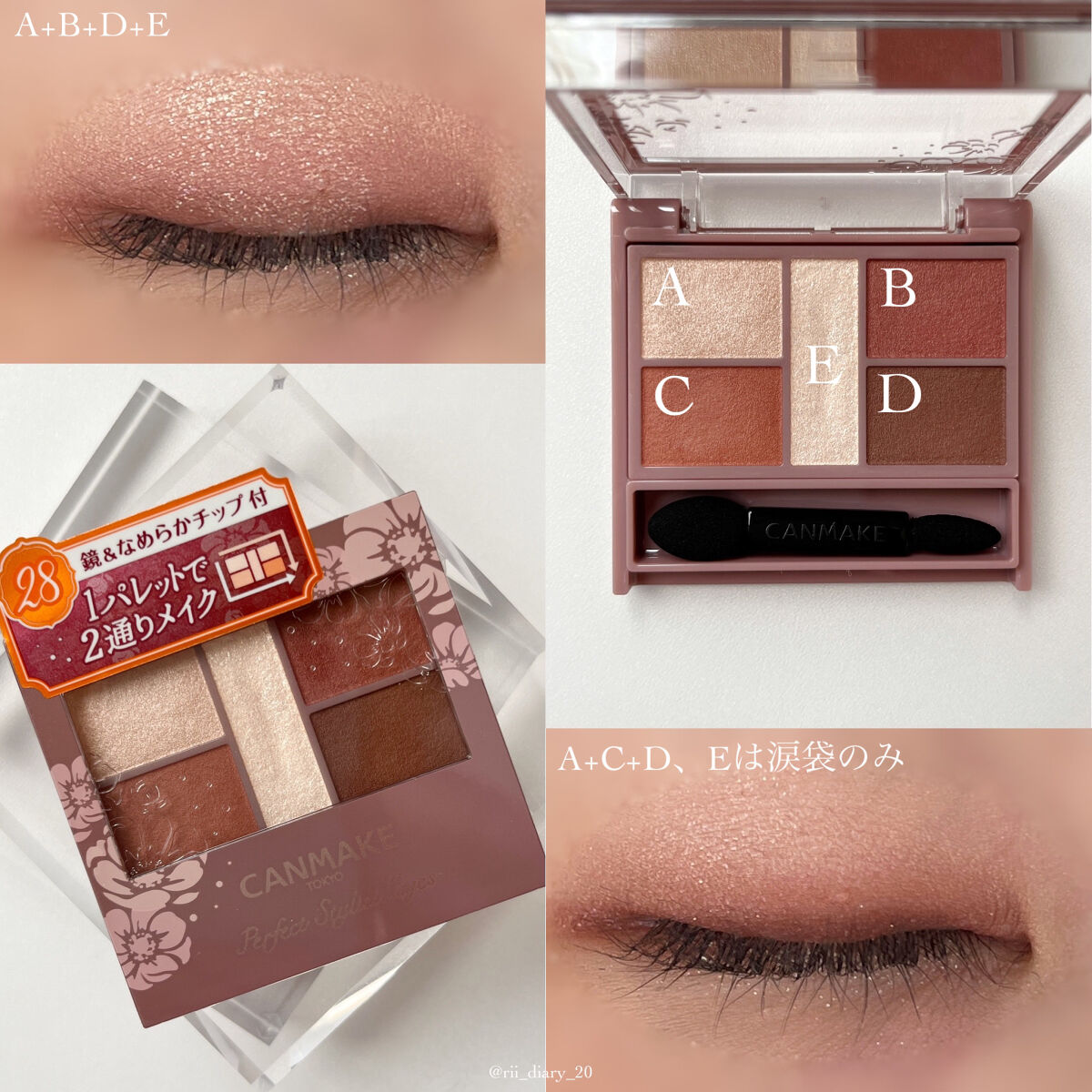 - 1枚のパレットで2つのスタイルが完成! 5色の欲ばりアイシャドウ♥ メインカラーを選んで2つのスタイルが楽しめる! A→B→D でスタイル1 A→C→D でスタイル2 繊細な粉質が、しっとりとまぶたに密着して色落ちを防ぎます。 透明感のあるキラうるトッピングジュエル(繊細ラメ)は、気分によってトッピング!