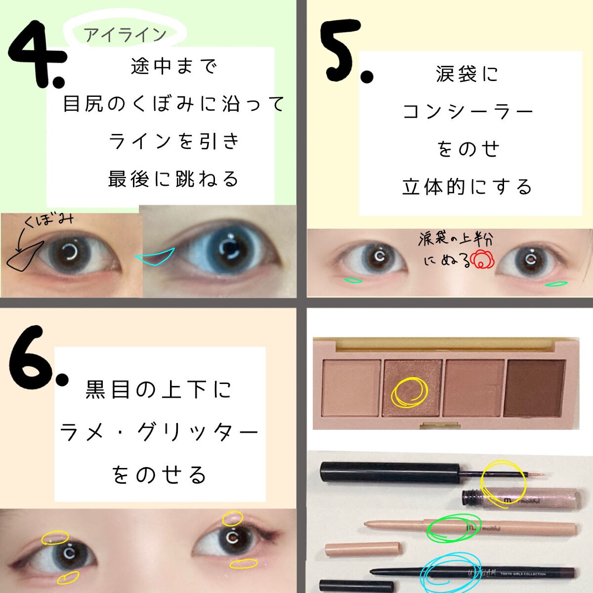 ピンクのアイシャドウをまぶた・涙袋にのせます (結構ガッツリで大丈夫です🎶) 涙袋を意識して、地雷盛りラインと涙袋の影を書く コンシーラーで素の唇を消す 薄い色のリップを素の唇より大きめにM字になるように塗る
