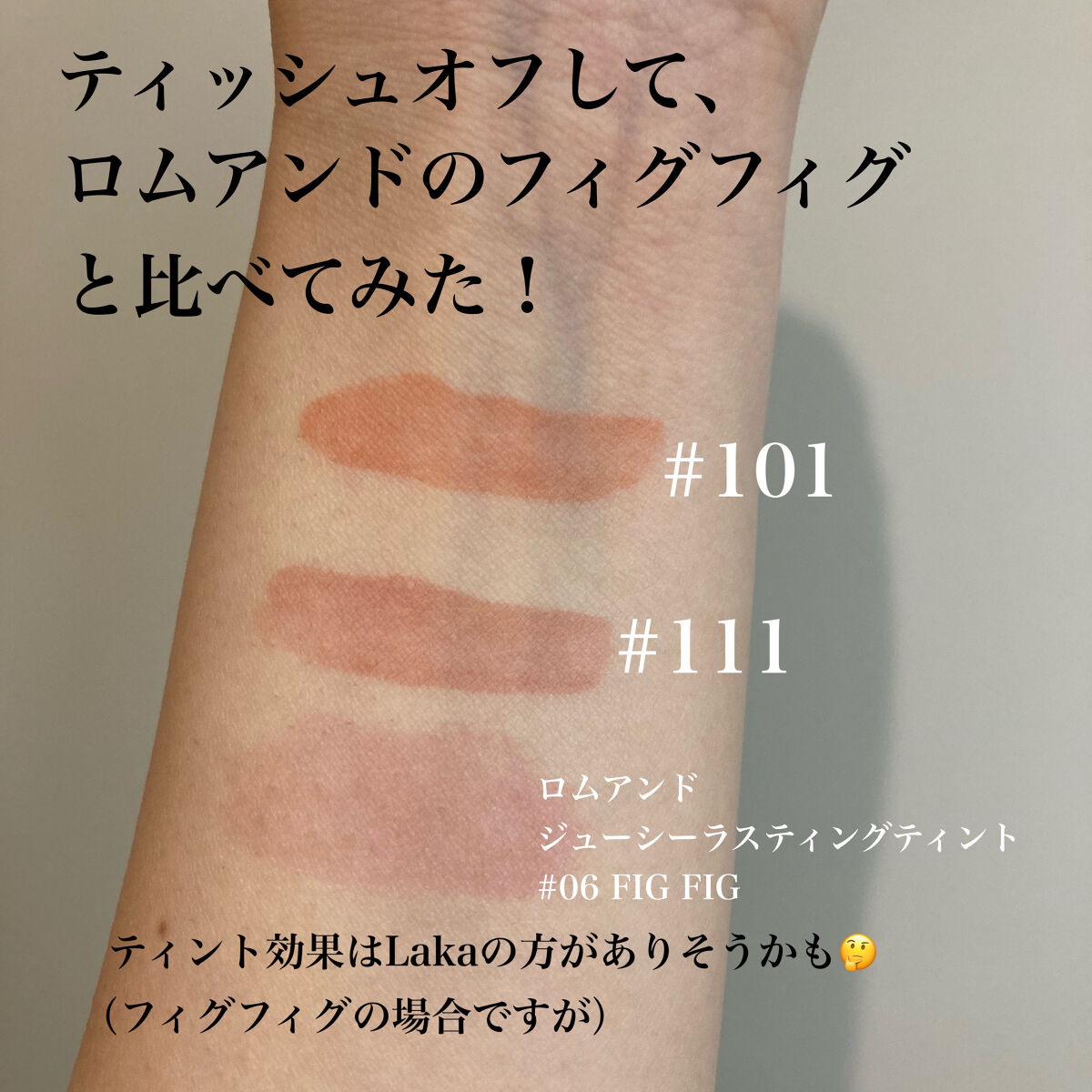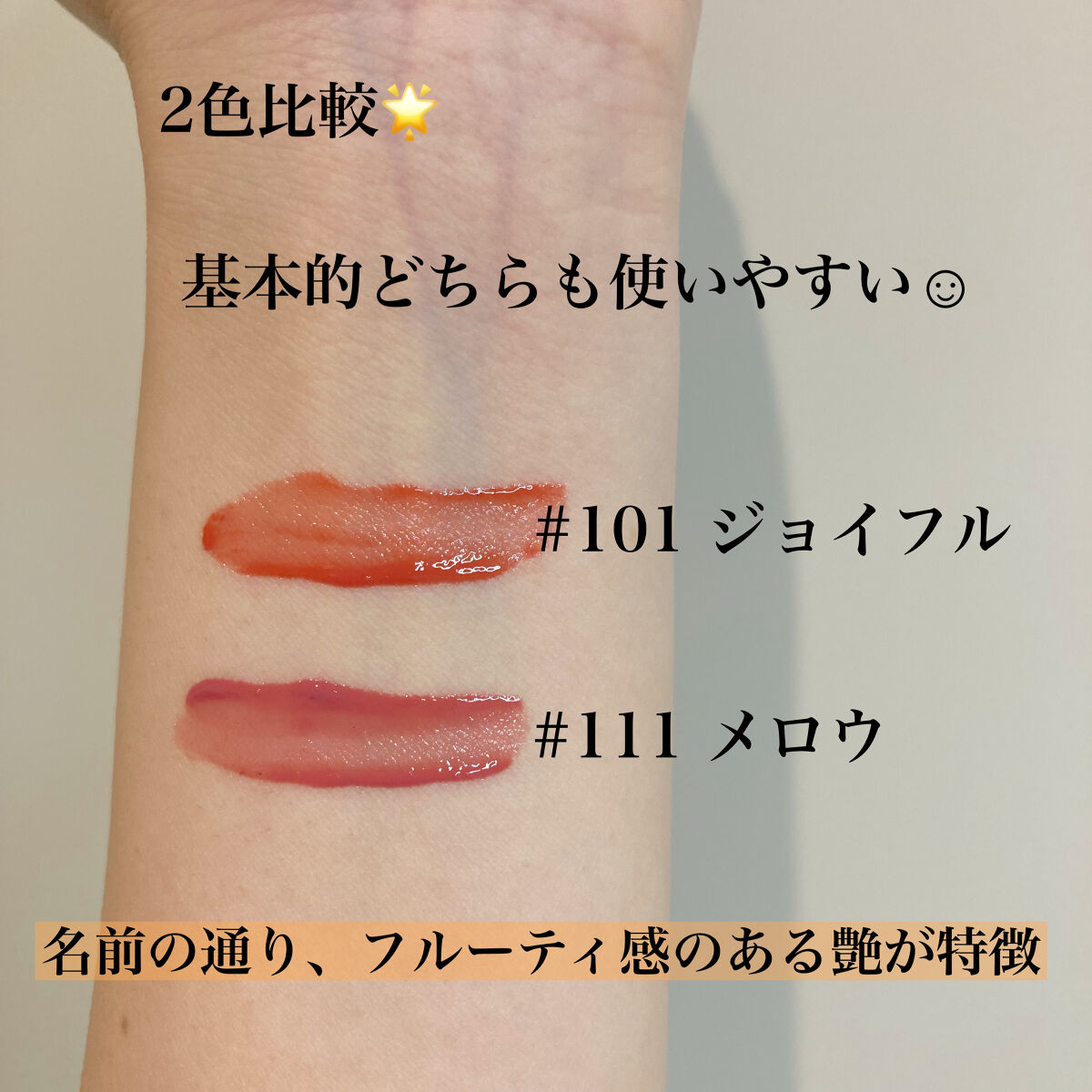 色味#101ジョイフル 特にイエベ春さん得意のコーラルピンク 顔がパッと明るくなります! 質感ツヤツヤぷるんぷるん感が強いのがこのリップの特徴です! 香りりんごの匂い🍎 ティント 能力ロムアンドのフィグフィグと比較したら、色持ちはLakaの方がありました。ただ水とか飲んだ時に色落ちを感じました。 最近買ったリップで1番お気に入りです🥺💕 使用感もよくて、買って損なしです🌸