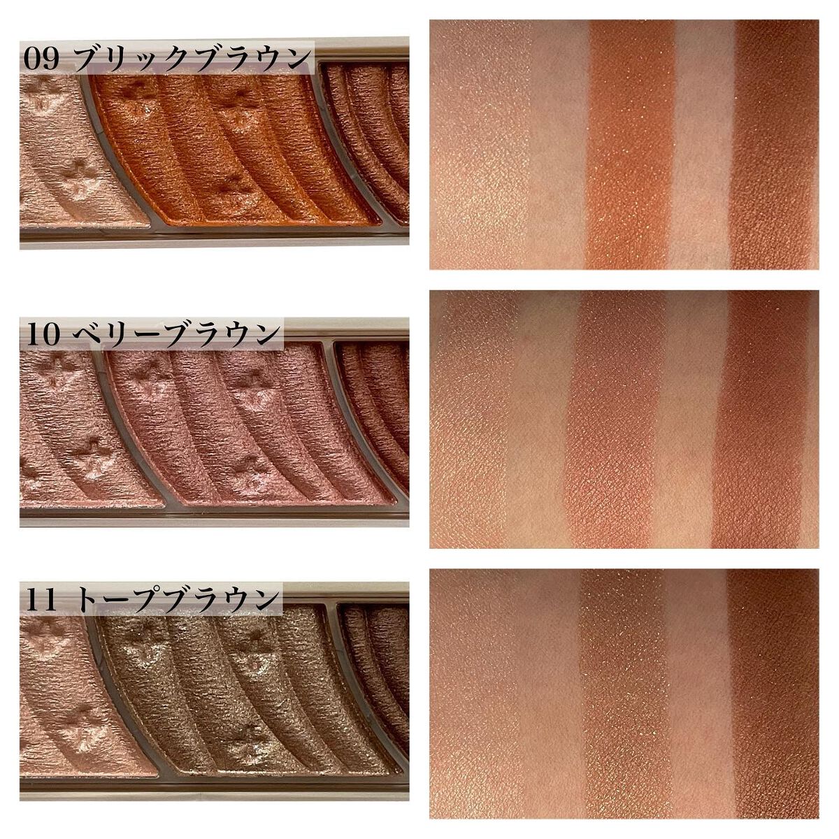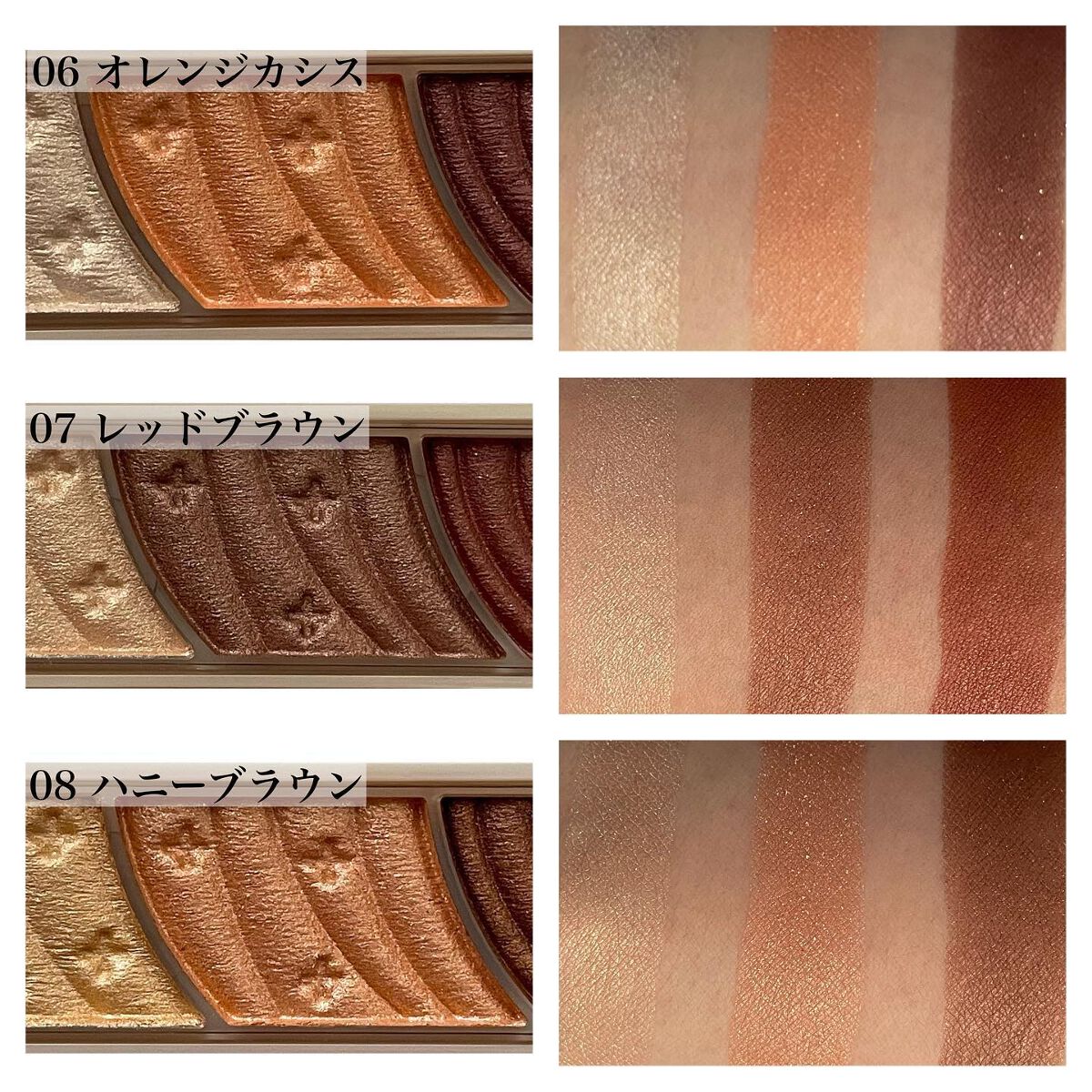 01 ナチュラルブラウン 1つは持っておきたいベーシックなベージュブラウンパレット イエローベースに◎ 06 オレンジカシス コントラストの効いた配色がおしゃれなオレンジ×カシスパレット イエローベースに◎ 09 ブリックブラウン こっくり深みのある大人なオレンジブラウンパレット 陰影のある目元が作れます イエベ秋に◎