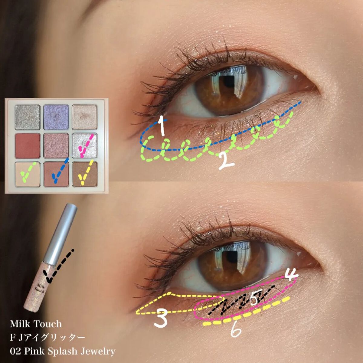 マットの発色をご覧ください。 マットでここまで発色するのって、珍しい。 特にパープル系のマットは、作るのが難しいらしく、ハイブランドでも発色がよくブレンドしやすいマットパープルを作るのに苦労するそう。 ですがこちらのaztkのマットパープルは、一塗りですんごい発色。 しっとりしているわけではないのですが、しっかり密着してくれる感じもします。 逆にパール系は少し発色優しめかな?と思いますが、ニュアンス的に使う分には問題なし。 ラメはギラギラのラメではなくチラチララメで、とっても上品。 いろんなシャドウと組み合わせて無限大にアイメイクが楽しめそうです。