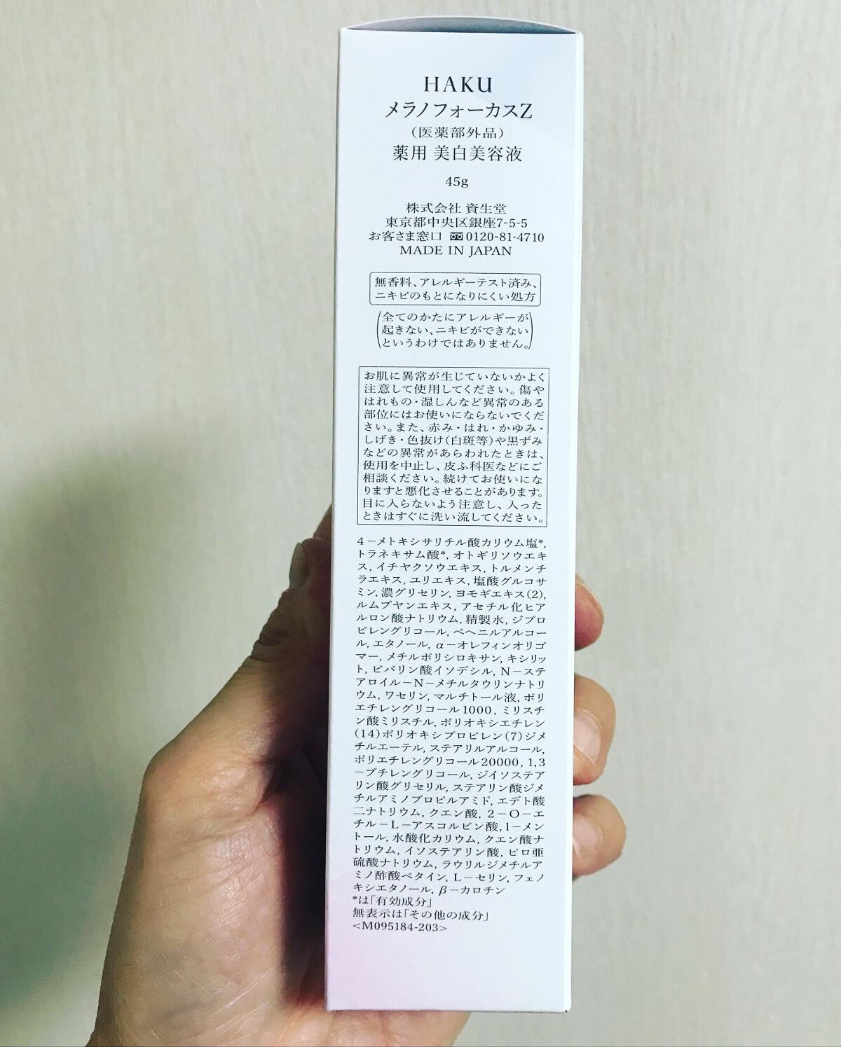 - <メラノフォーカスZ> 有効成分 トラネキサム酸、4-メトキシサリチル酸カリウム塩 その他の成分 ベヘニルアルコール、フェノキシエタノール、エタノール、ワセリン、濃グリセリン、クエン酸、イソステアリン酸、ステアリルアルコール、ルムプヤンエキス、精製水、ジプロピレングリコール、ポリオキシエチレン(14)ポリオキシプロピレン(7)ジメチルエーテル、メチルポリシロキサン、エデト酸二ナトリウム、ピロ亜硫酸ナトリウム、水酸化カリウム、アセチル化ヒアルロン酸ナトリウム、1,3-ブチレングリコール、クエン酸ナトリウム、キシリット、ポリエチレングリコール20000、β-カロチン、N-ステアロイル-N-メチルタウリンナトリウム、ジイソステアリン酸グリセリル、l-メントール、ポリエチレングリコール1000、ミリスチン酸ミリスチル、L-セリン、α-オレフィンオリゴマー、2-O-エチル-L-アスコルビン酸、ラウリルジメチルアミノ酢酸ベタイン、マルチトール液、塩酸グルコサミン、ユリエキス、ヨモギエキス(2)、トルメンチラエキス、イチヤクソウエキス、オトギリソウエキス、ピバリン酸イソデシル、ステアリン酸ジメチルアミノプロピルアミド <メラノフォーカスZ レフィル> 有効成分 トラネキサム酸、4-メトキシサリチル酸カリウム塩 その他の成分 ベヘニルアルコール、フェノキシエタノール、エタノール、ワセリン、濃グリセリン、クエン酸、イソステアリン酸、ステアリルアルコール、ルムプヤンエキス、精製水、ジプロピレングリコール、ポリオキシエチレン(14)ポリオキシプロピレン(7)ジメチルエーテル、メチルポリシロキサン、エデト酸二ナトリウム、ピロ亜硫酸ナトリウム、水酸化カリウム、アセチル化ヒアルロン酸ナトリウム、1,3-ブチレングリコール、クエン酸ナトリウム、キシリット、ポリエチレングリコール20000、β-カロチン、N-ステアロイル-N-メチルタウリンナトリウム、ジイソステアリン酸グリセリル、l-メントール、ポリエチレングリコール1000、ミリスチン酸ミリスチル、L-セリン、α-オレフィンオリゴマー、2-O-エチル-L-アスコルビン酸、ラウリルジメチルアミノ酢酸ベタイン、マルチトール液、塩酸グルコサミン、ユリエキス、ヨモギエキス(2)、トルメンチラエキス、イチヤクソウエキス、オトギリソウエキス、ピバリン酸イソデシル、ステアリン酸ジメチルアミノプロピルアミド <メラノフォーカスZ 20> 有効成分 4-メトキシサリチル酸カリウム塩、トラネキサム酸 その他の成分 オトギリソウエキス、イチヤクソウエキス、トルメンチラエキス、ユリエキス、塩酸グルコサミン、濃グリセリン、ヨモギエキス(2)、ルムプヤンエキス、アセチル化ヒアルロン酸ナトリウム、精製水、ジプロピレングリコール、ベヘニルアルコール、エタノール、α-オレフィンオリゴマー、メチルポリシロキサン、キシリット、ピバリン酸イソデシル、N-ステアロイル-N-メチルタウリンナトリウム、ワセリン、マルチトール液、ポリエチレングリコール1000、ミリスチン酸ミリスチル、ポリオキシエチレン(14)ポリオキシプロピレン(7)ジメチルエーテル、ステアリルアルコール、ポリエチレングリコール20000、1,3-ブチレングリコール、ジイソステアリン酸グリセリル、ステアリン酸ジメチルアミノプロピルアミド、エデト酸二ナトリウム、クエン酸、2-O-エチル-L-アスコルビン酸、l-メントール、水酸化カリウム、クエン酸ナトリウム、イソステアリン酸、ピロ亜硫酸ナトリウム、ラウリルジメチルアミノ酢酸ベタイン、L-セリン、フェノキシエタノール、β-カロチン <20g> ベヘニルアルコール、フェノキシエタノール、エタノール、ワセリン、濃グリセリン、クエン酸、イソステアリン酸、ステアリルアルコール、ルムプヤンエキス、トラネキサム酸、精製水、ジプロピレングリコール、ポリオキシエチレン(14)ポリオキシプロピレン(7)ジメチルエーテル、メチルポリシロキサン、エデト酸二ナトリウム、ピロ亜硫酸ナトリウム、水酸化カリウム、アセチル化ヒアルロン酸ナトリウム、1,3-ブチレングリコール、クエン酸ナトリウム、キシリット、ポリエチレングリコール20000、β-カロチン、N-ステアロイル-N-メチルタウリンナトリウム、ジイソステアリン酸グリセリル、l-メントール、ポリエチレングリコール1000、ミリスチン酸ミリスチル、L-セリン、α-オレフィンオリゴマー、4-メトキシサリチル酸カリウム塩、2-O-エチル-L-アスコルビン酸、ラウリルジメチルアミノ酢酸ベタイン、マルチトール液、塩酸グルコサミン、ユリエキス、ヨモギエキス(2)、トルメンチラエキス、イチヤクソウエキス、オトギリソウエキス、ピバリン酸イソデシル、ステアリン酸ジメチルアミノプロピルアミド