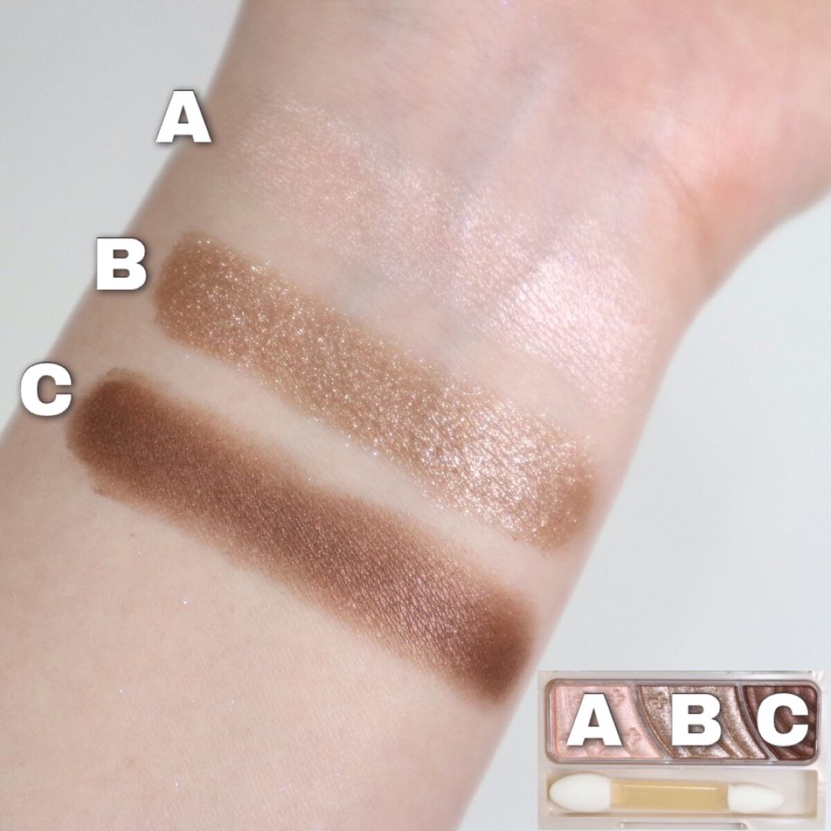 - 3色で簡単に明るく大きな目元に。 しっとり感触のアイシャドウ。 くすみを飛ばす明るさベース、ひとえ・奥二重の方でも幅広く塗れる肌なじみの良い中間色、 濃密高発色の締め色が目の輪郭を強調し大きな目元に。 微細パール配合でくすみを飛ばし、明るい目元へ。