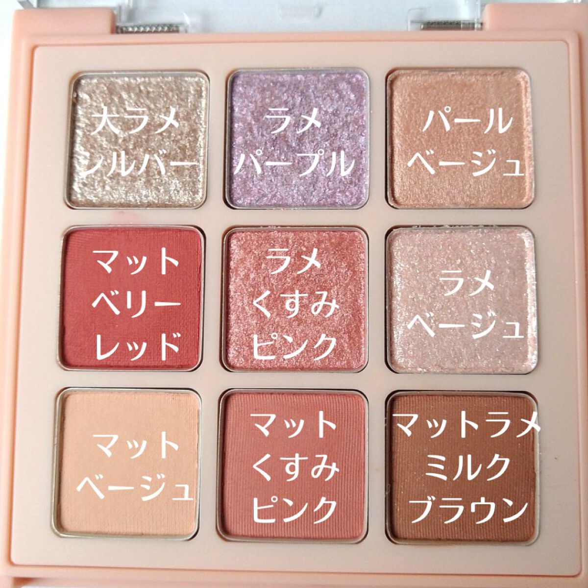 - 01 <a/f> ジメチコン、トリ(カプリル酸/カプリン酸)グリセリル、(ジメチコン/ビニルジメチコン) クロスポリマー、タルク、カルナウバロウ、クロルフェネシン、デヒドロ酢酸Na、ラウロイルリシン、トコフェロール、ホウケイ酸(Ca/Al)、マイカ、(PET/ポリメタクリル酸メチル)ラミネート、酸化チタン、酸化鉄、赤226、グンジョウ、酸化スズ <b/e> トリ(カプリル酸/カプリン酸)グリセリル、シリカ、ダイマージリノール酸ジ(イソステアリル/フィトステリル)、合成フルオロフロゴパイト、ダイマージリノール酸ダイマージリノレイルビス(ベヘニル/イソステアリル/フィトステリル)、水酸化Al、カルナウバロウ、トコフェロール、ホウケイ酸(Ca/Al)、マイカ、酸化チタン、酸化鉄、グンジョウ、赤226、コンジョウ、酸化スズ <c> アルミナ、合成フルオロフロゴパイト、タルク、ジフェニルシロキシフェニルトリメチコン、水添ポリデセン、(イソステアリン酸ポリグリセリル-2/ダイマージリノール酸)コポリマー、ジメチコン、硫酸Ba、ジステアリン酸Al、クロルフェネシン、デヒドロ酢酸Na、ステアリン酸Mg、トコフェロール、酸化チタン、マイカ、酸化鉄、グンジョウ、酸化スズ <d/g/h/i> タルク、合成フルオロフロゴパイト、窒化ホウ素、スクワラン、ナイロン-12、(ビニルジメチコン/メチコンシルセスキオキサン)クロスポリマー、ペンチレングリコール、ホホバ種子油、デヒドロ酢酸Na、水酸化Al、シア脂、トコフェロール、マイカ、酸化鉄、酸化チタン、赤226、グンジョウ、ホウケイ酸(Ca/Al)、酸化スズ 02 <a> ジメチコン、トリ(カプリル酸/カプリン酸)グリセリル、(ジメチコン/ビニルジメチコン)クロスポリマー、タルク、カルナウバロウ、クロルフェネシン、デヒドロ酢酸Na、ラウロイルリシン、トコフェロール、マイカ、ホウケイ酸(Ca/Al)、酸化チタン、酸化鉄、酸化スズ <b> アルミナ、タルク、合成フルオロフロゴパイト、ジフェニルシロキシフェニルトリメチコン、水添ポリデセン、(イソステアリン酸ポリグリセリル-2/ダイマージリノール酸)コポリマー、ジメチコン、硫酸Ba、ジステアリン酸Al、ステアリン酸Mg、クロルフェネシン、デヒドロ酢酸Na、トコフェロール、酸化チタン、マイカ、酸化鉄、赤226、グンジョウ、酸化スズ <c/e/f> トリ(カプリル酸/カプリン酸)グリセリル、シリカ、ダイマージリノール酸ジ(イソステアリル/フィトステリル)、ダイマージリノール酸ダイマージリノレイルビス(ベヘニル/イソステアリル/フィトステリル)、水酸化Al、合成フルオロフロゴパイト、カルナウバロウ、トコフェロール、マイカ、ホウケイ酸(Ca/Al)、酸化チタン、酸化鉄、黄4、赤226、グンジョウ、酸化スズ <d/g/h/i> タルク、合成フルオロフロゴパイト、窒化ホウ素、スクワラン、ナイロン-12、(ビニルジメチコン/メチコンシルセスキオキサン)クロスポリマー、ペンチレングリコール、ホホバ種子油、デヒドロ酢酸Na、水酸化Al、シア脂、トコフェロール、マイカ、酸化鉄、酸化チタン、ホウケイ酸(Ca/Al)、赤226、黄4、グンジョウ、酸化スズ ※アルファベットはパレットを正面から見た1段目左からabc、2段目左からdef、3段目左からghiの順です。