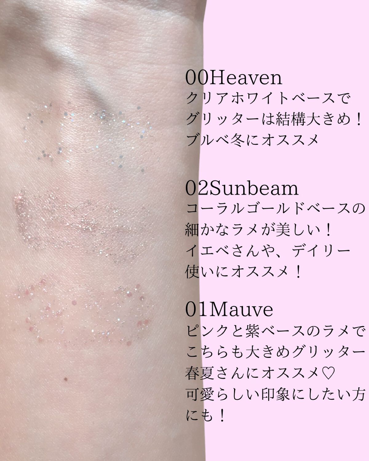 【Dear.Aブルベ推し🩷人気商品ガチレビュー】Dear.A#グリッターアイシャドウ■01MAUVEクリアベースに、ピンクやブルーに光るオーロララメ+六角ホロ💕【テクスチャー】ウォーターベースで重ねてもパキッとなりにくく、ペタペタ感も気になら...