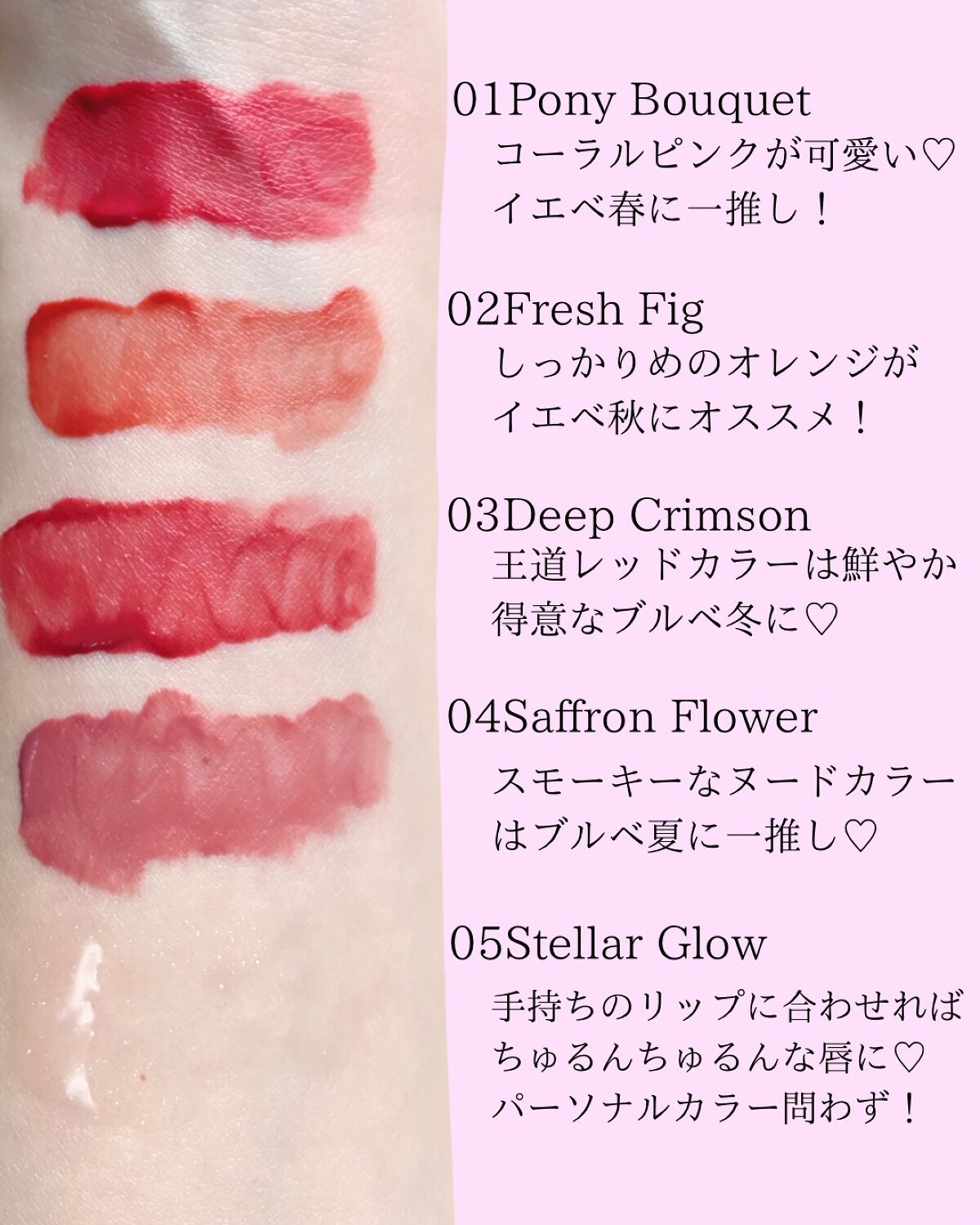 このぷるっぷる唇になれる最高リップを よくぞリニューアルしてくれた🥹💕 つやぷるリップが大好きでこれしか 使ってない時があったなぁ😌💄✨ 明るいベージュで唇にのせるとナチュラルに 血色感UP!! 明るさ、柔らかさが得意なイエベ春さんにおすすめ♡ 明るい黄み寄りピンク♡ イエベ春さんに幅広くおすすめ♡ 腕にだすとしっかりめブラウンカラーだけど 唇にのせるのそんなに重たくない印象! イエベ秋さんに幅広くおすすめ♡ 明るさ得意な春夏タイプが使いやすい ピンクカラー♡ 名前の通り万人に愛されそうなピンク♡ イメージしていたテラコッタより ずっと柔らかく穏やかなカラー♡ 柔らかいイメージにしたい 春秋さんにおすすめ♡ ほんのりくすみがかったピンクブラウン♡ 夏秋またぐかたにおすすめですが イエベ春の私も好き♡ 全7色の中で1番青みを感じるカシスカラー♡ ブルベさんにおすすめ♡