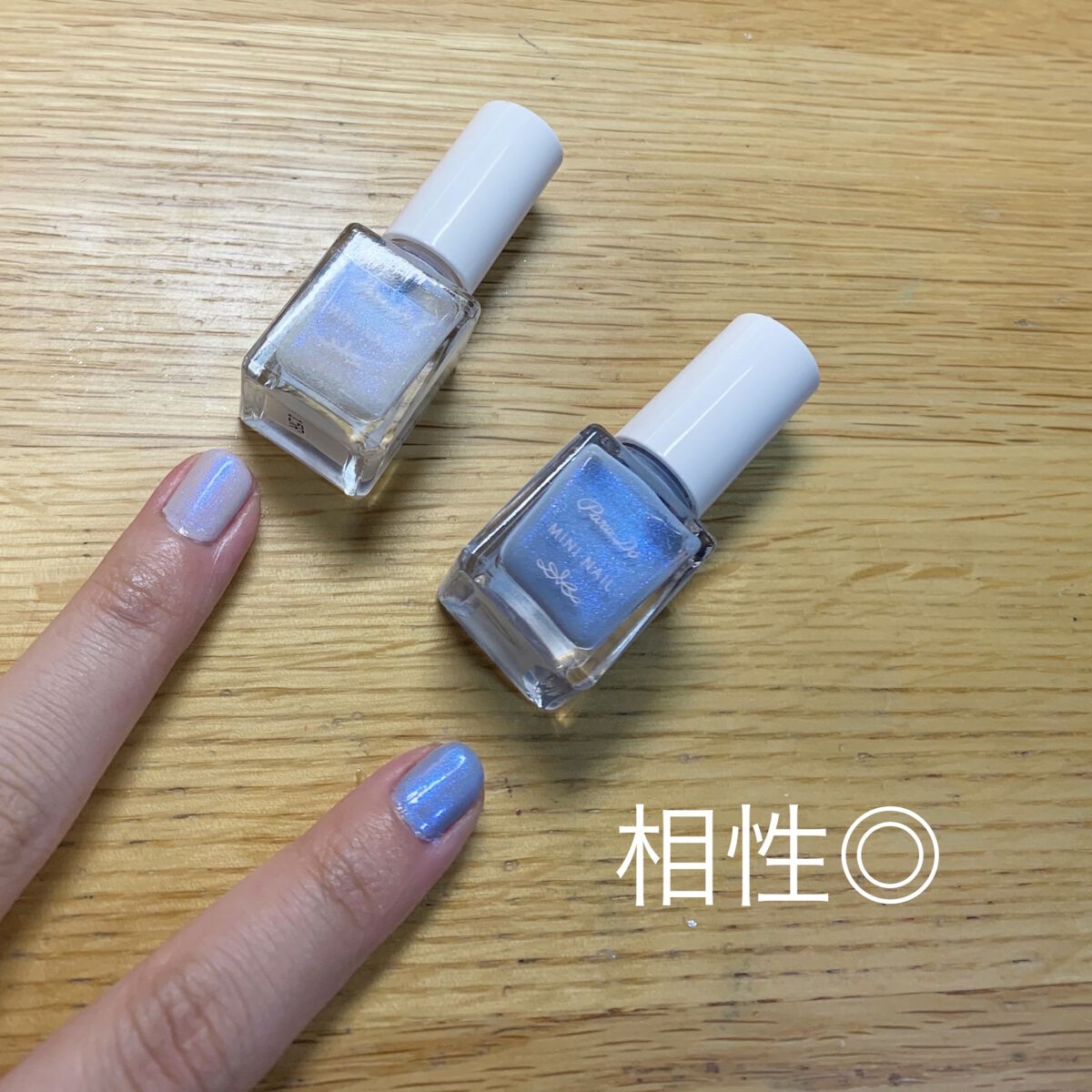 偏光パール+この淡いブルーの組み合わせが、本っ当に絶妙!🥲✨ 派手すぎず洗練されたカラーで、涼しげな印象を与えてくれます。組み合わせによって、クールにもポップにもフェミニンにもなるカラーで、とても重宝しています。 2度塗りの方が色自体は綺麗に映えますが、1度塗りの控えめな感じもかわいい。私はどっちも好きです♡