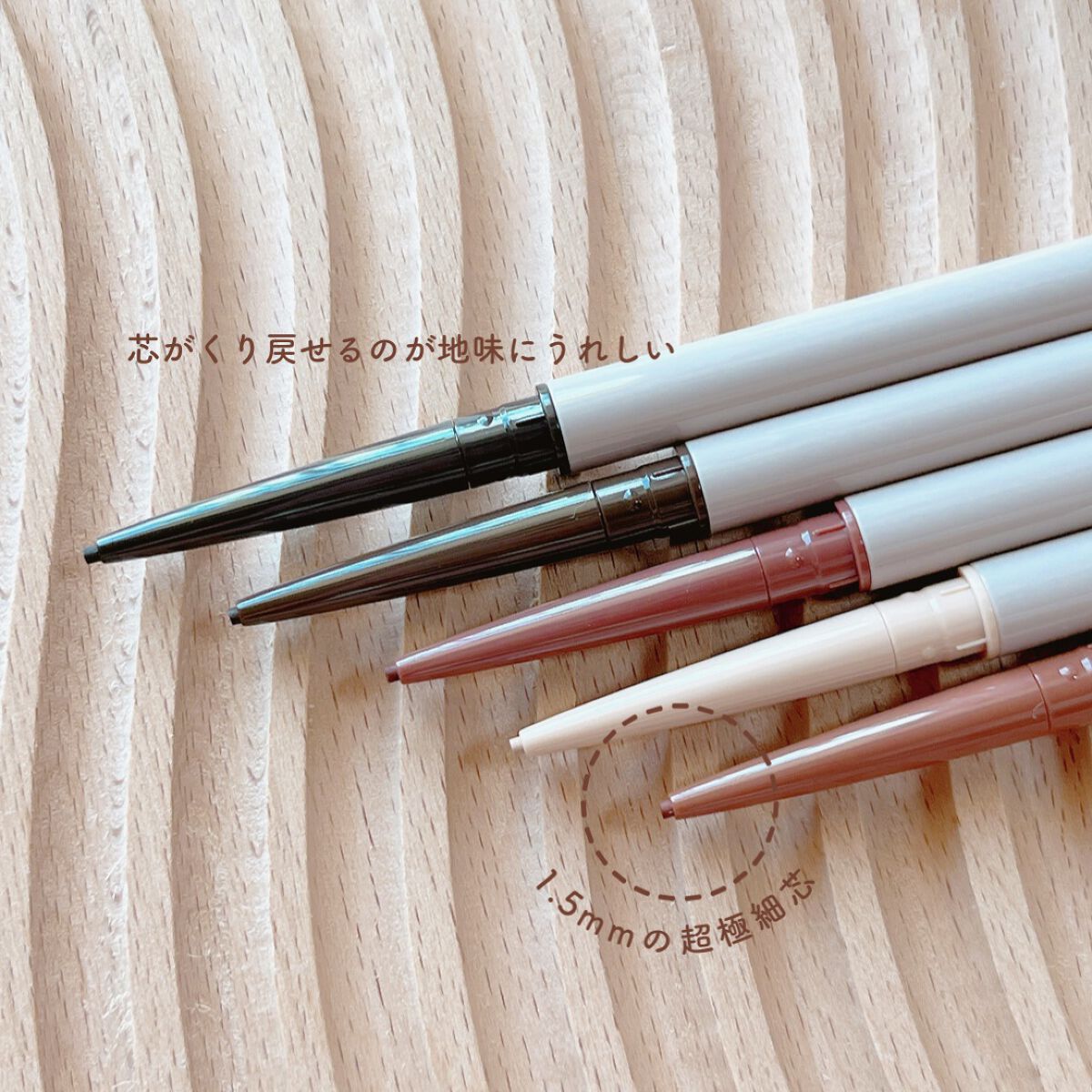 - 濃淡自在のやわらか発色で、夜まで落ちないクリーミーペンシルライナー。目元に馴染む自然な発色で、濃くも薄くも調節自在です。 とろけるような描き心地の極細1.5mm芯で、目のキワにもやさしいタッチでするする描けます。 ウォータープルーフ&スマッジプルーフの耐久処方で、美発色をキープします。 目元をケアする美容液成分(パンテノール、ヒアルロン酸*、センブリエキス ※すべて保湿)を配合しました。 目元の印象を濃くしすぎない、抜け感のある5色のニュアンスカラー。 目元を自然に際立てるやわらかな発色にこだわり、メイク初心者の方にも、普段アイライナーを使わない方にも手に取っていただきたいアイテムとなっております。 繰り戻し可能なスリムペンシルです。 * ヒアルロン酸Na