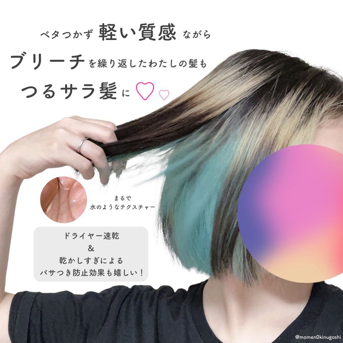 髪のキメ美容ウォータートリートメントは洗い流さないトリートメントで、美容ウォーターが髪に浸透し、持続型ウォーターヴェールでつるサラ髪に仕上げます サラサラしたお水のようにサッパリしたテクスチャーでオイルのようなペッタリ感がなく軽いつけ心地だよ。 ブリーチによるダメージで髪の毛流れが悪く広がりやすい髪が整って、まとまりやすくなったよ!